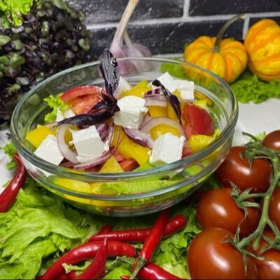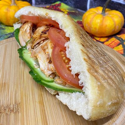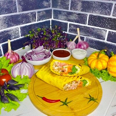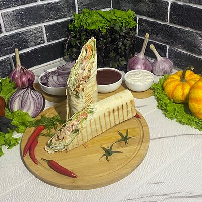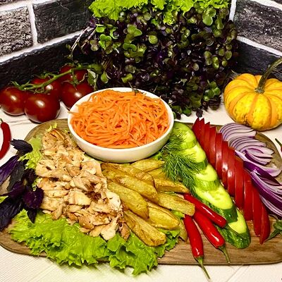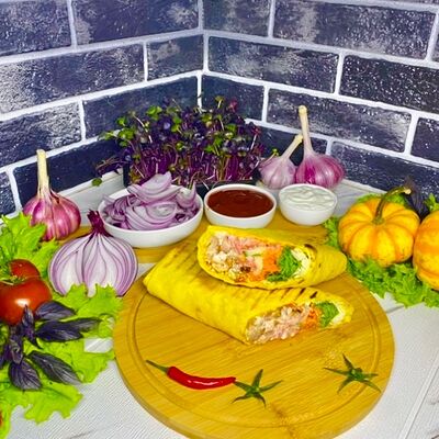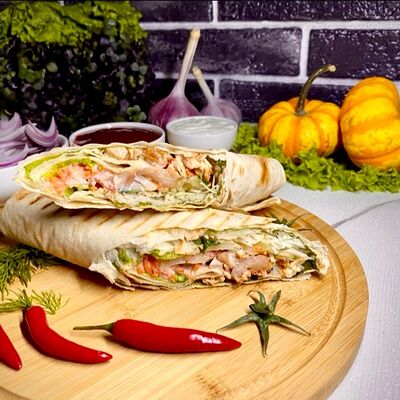 Булочка, куриное филе, картофель фри, огурцы, помидоры, лук, фирменные соусы белый и красный