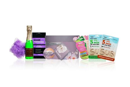 Женский подарочный набор (пена для ванн Liss Kroully 260 мл, соль для ванн 100 г, бурлящий шар для ванн Delicare Lavender + apricot 130 г, маска для волос Delicare Глубокое увлажнение 25мл, отшелушивающие носочки для ног WEIS) доставка
