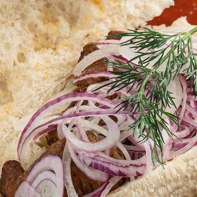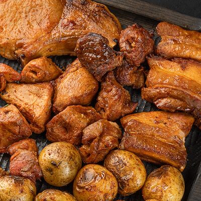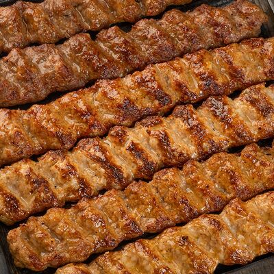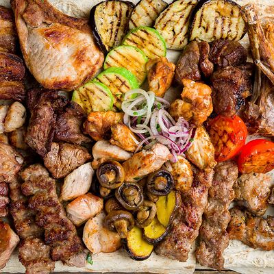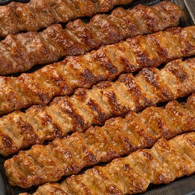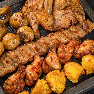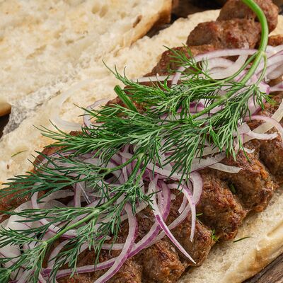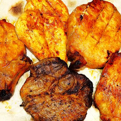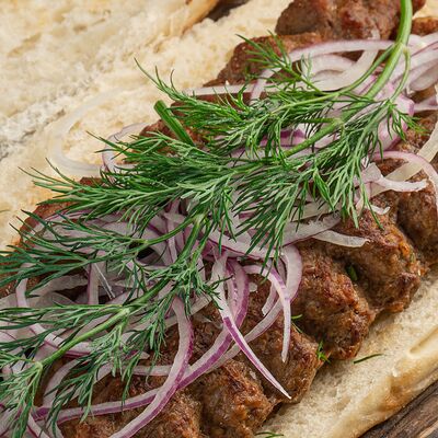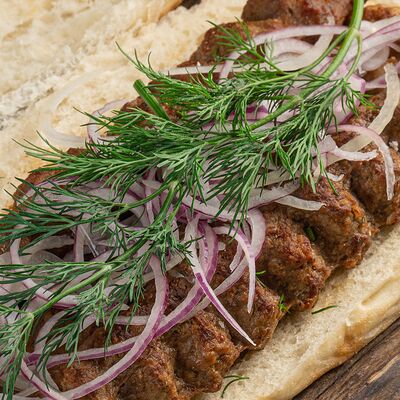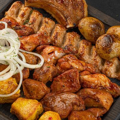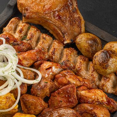 Свинина, курица, люля-кебаб, картофель, лепешка, соусы
