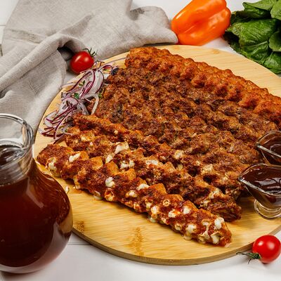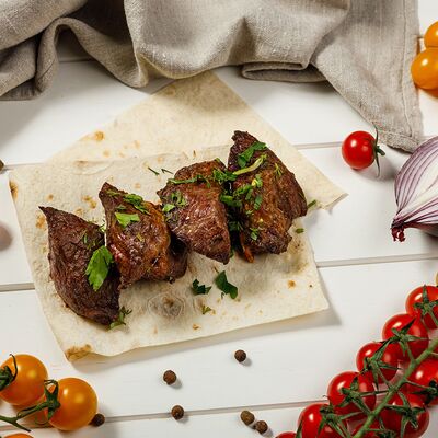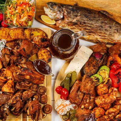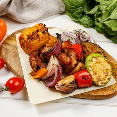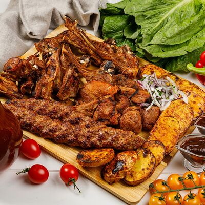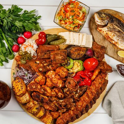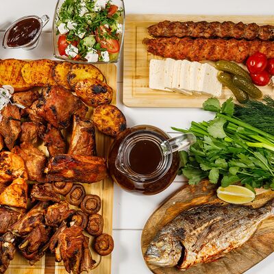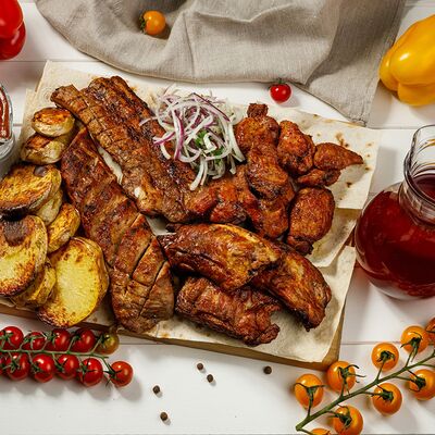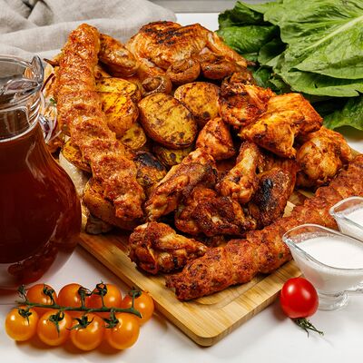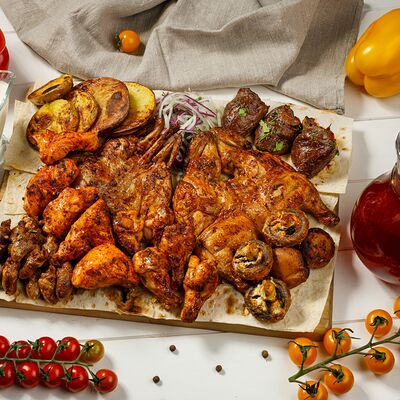 Цыплёнок-корнишон на мангале (1 порция), шашлык из куриных крылышек (2 порции), куриное сердце на мангале (1 порция), шашлык из куриной грудки (1 порция), грибы на углях (1 порция), люля-кебаб из курицы (2 порции), соус (2 шт.), морс ягодный собственного производства (2 л), лаваш (2 шт.)