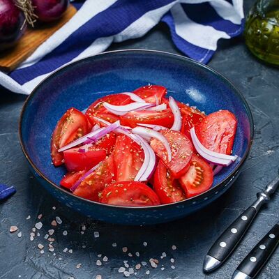 Помидоры, огурцы, лук, оливки, перец, сыр фета, орегано, оливковое масло
