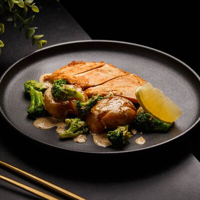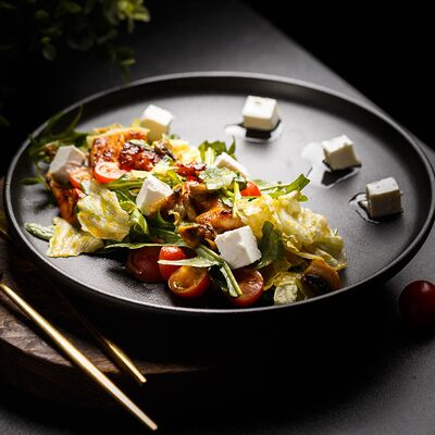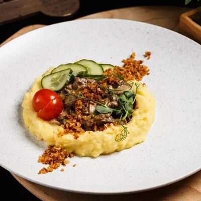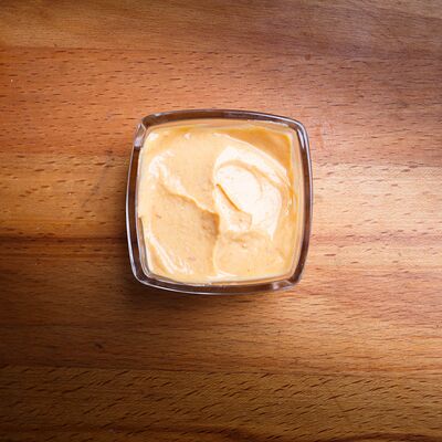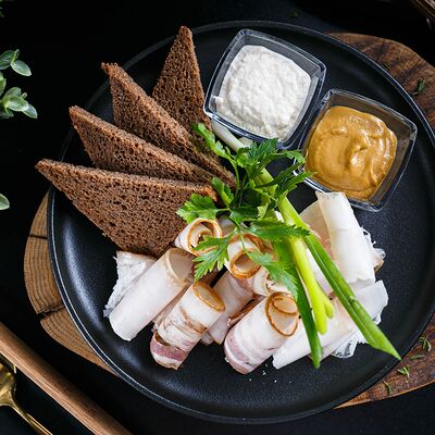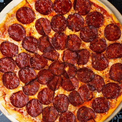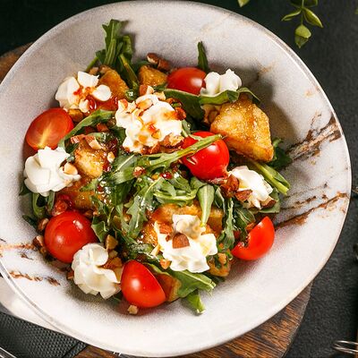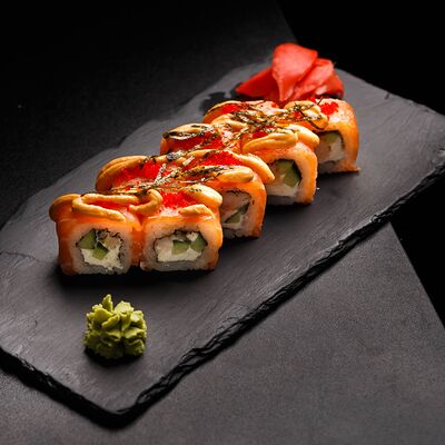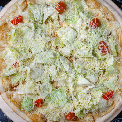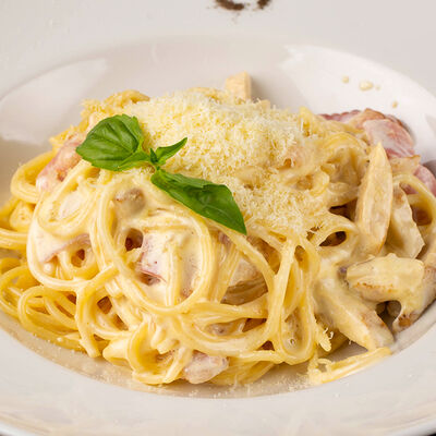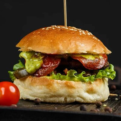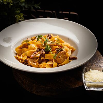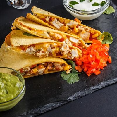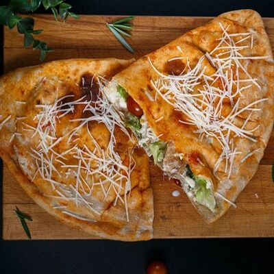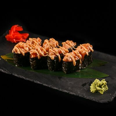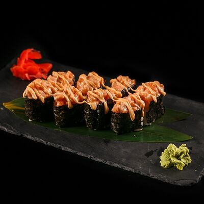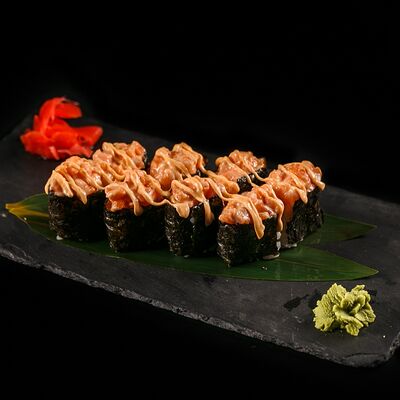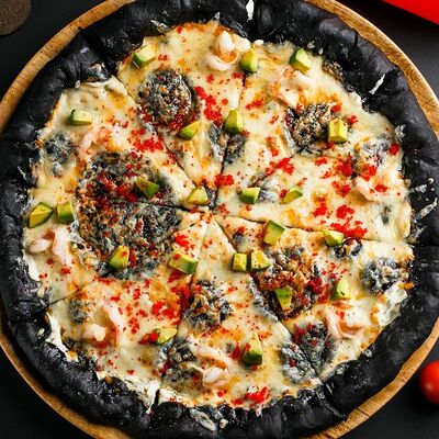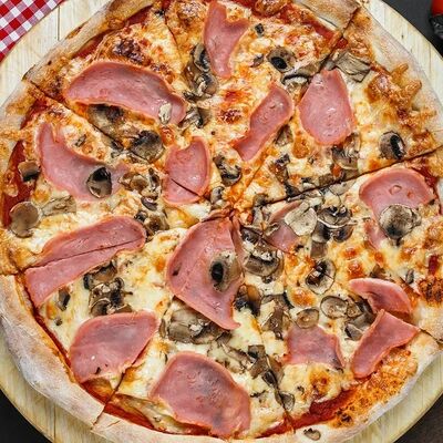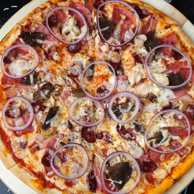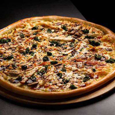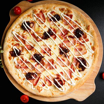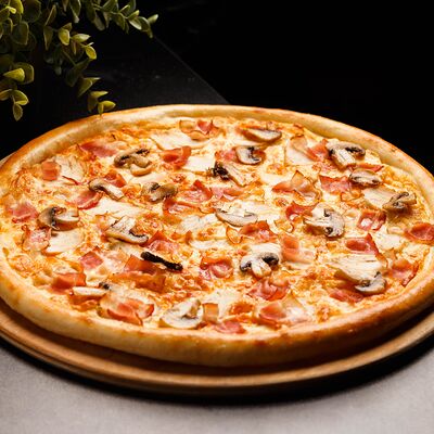 Соус спайси, сыр моцарелла, куриное филе, шампиньоны, бекон