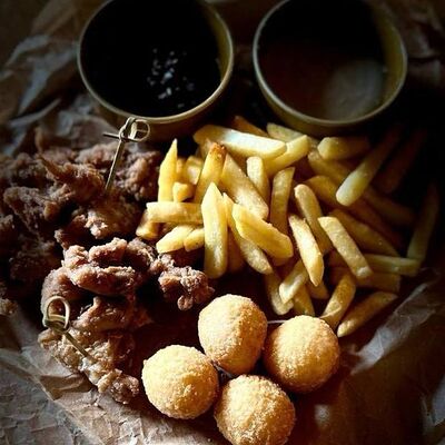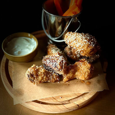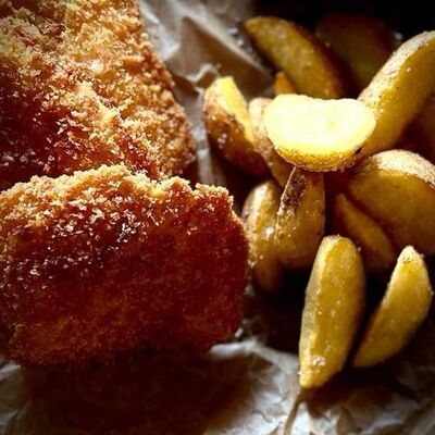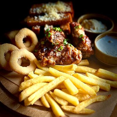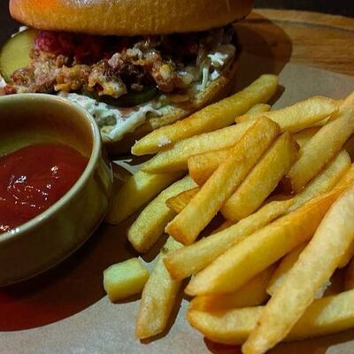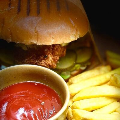 Булочка бриошь, микс-салат, соленый огурец, куриное филе, запанированное в пармезане, соус трюфельный, соус блю чиз. Картофель фри и кетчуп