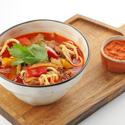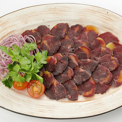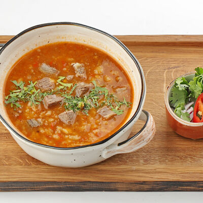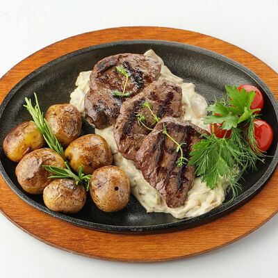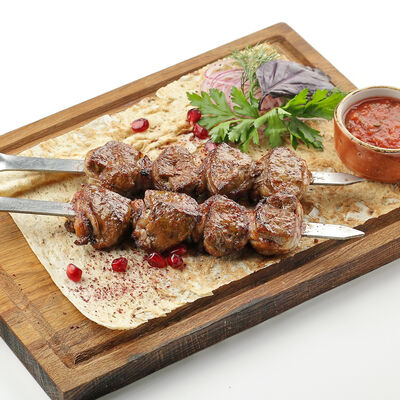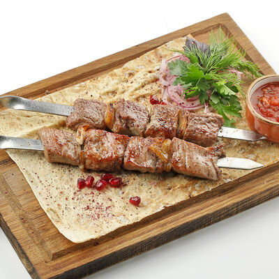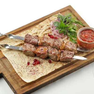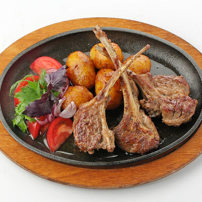 Сочная корейка молодого барашка, маринованная в специях, запекается на мангале. Подается с домашней аджикой