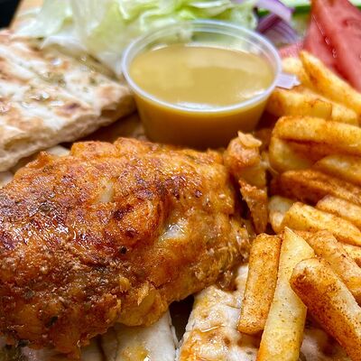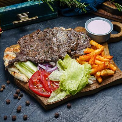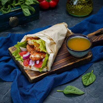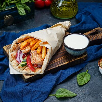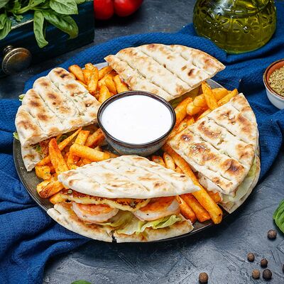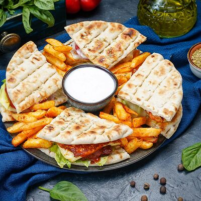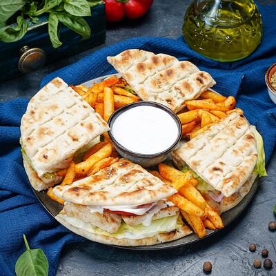 Греческий Клаб-сэндвич с курицей подается в пите, с соусом и картофелем фри