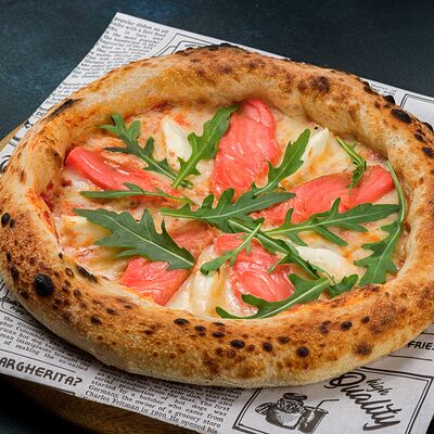 Соус красный, сыр моцарелла, креметте, лосось, руккола, тесто (24 см)