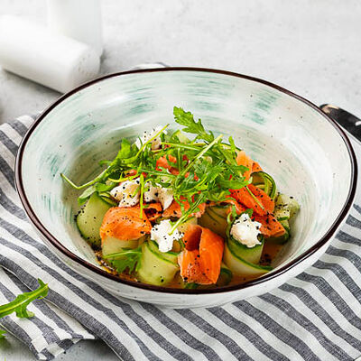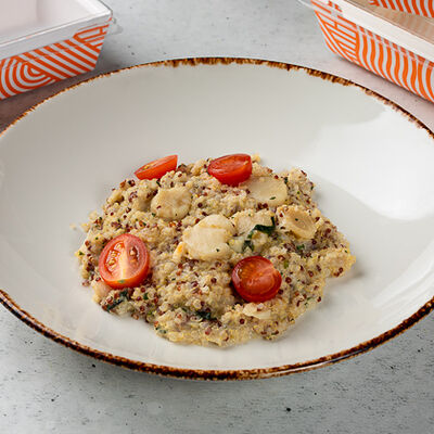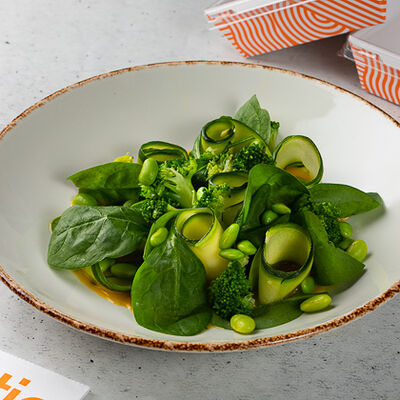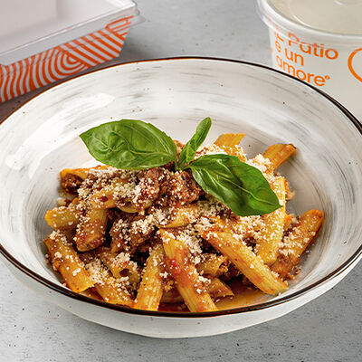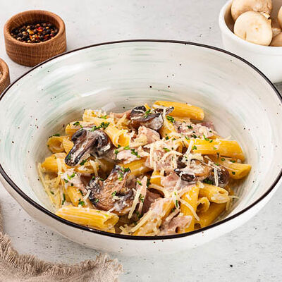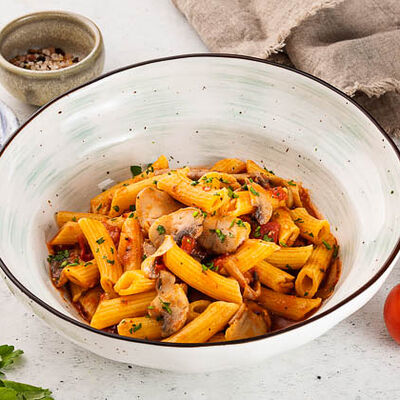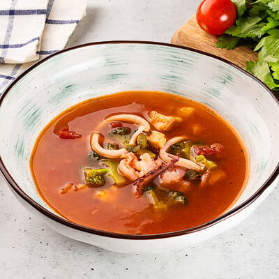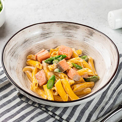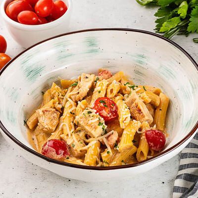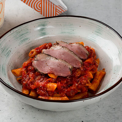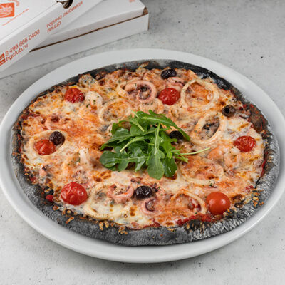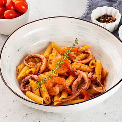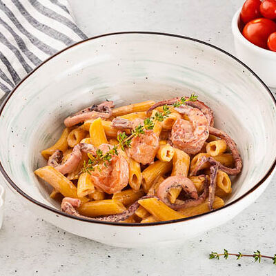 Фирменная паста с тигровыми креветками и щупальцами кальмара в сливочном соусе с кремом из вяленых томатов и чили. Украсит любой обед или ужин