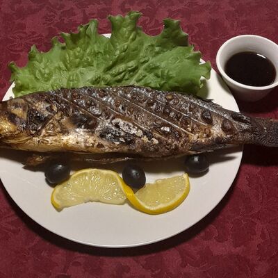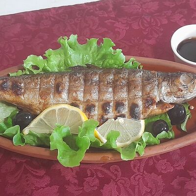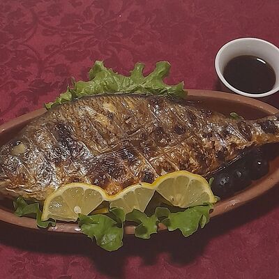 Дорадо на решетке, жаренная на углях. Подается с лимоном зеленью, маслинами и гранатовым соусом