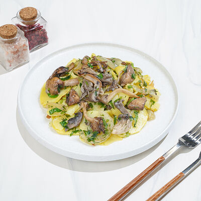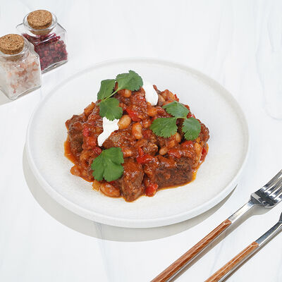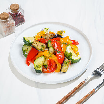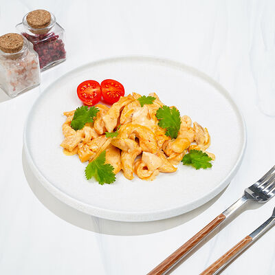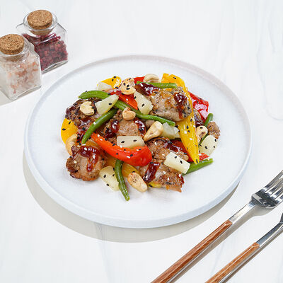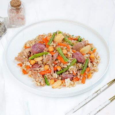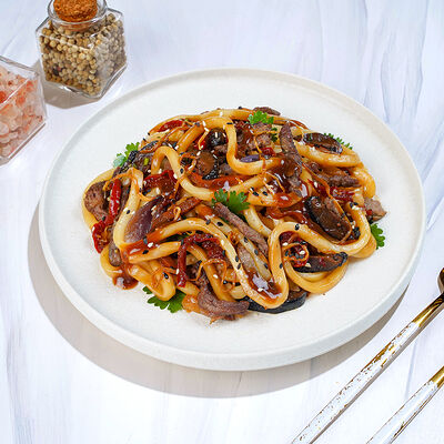 Пшеничная лапша Удон с говядиной, грибами шиитаке, болгарским перцем и морковью в устричном соусе