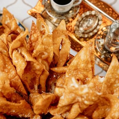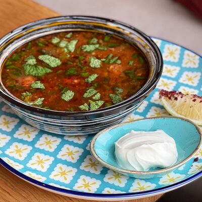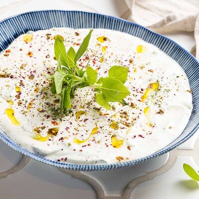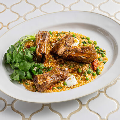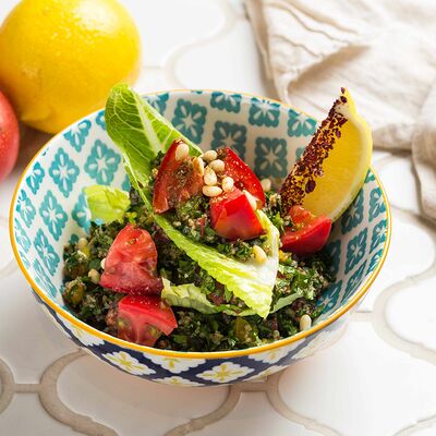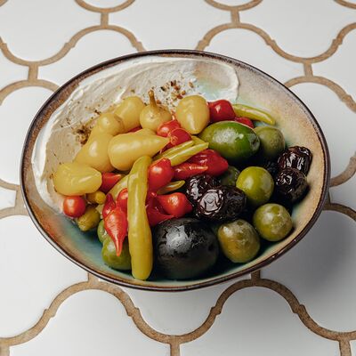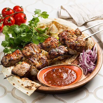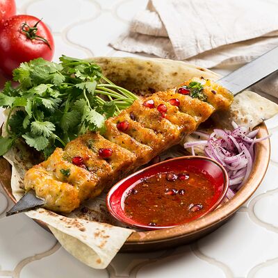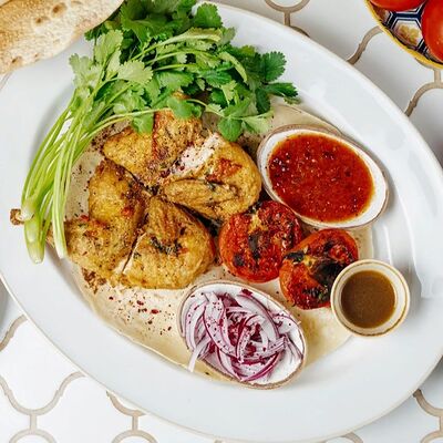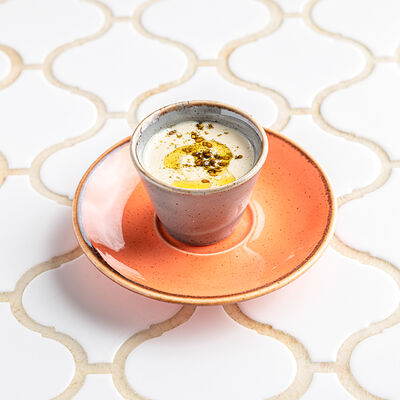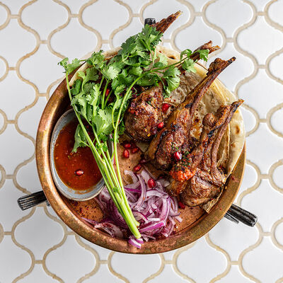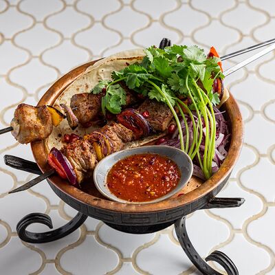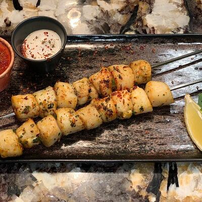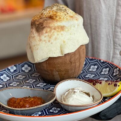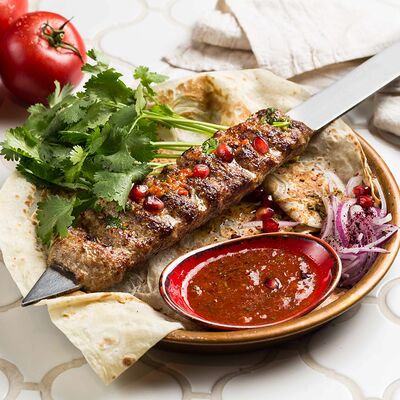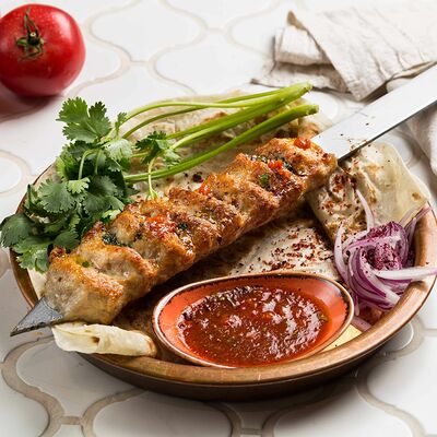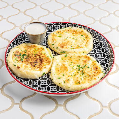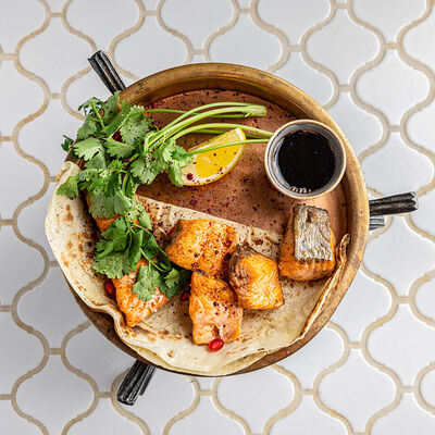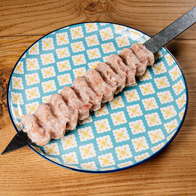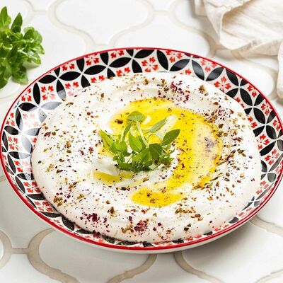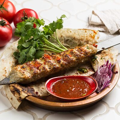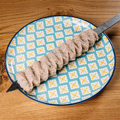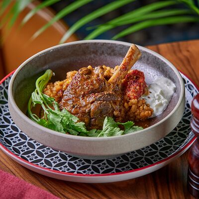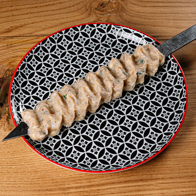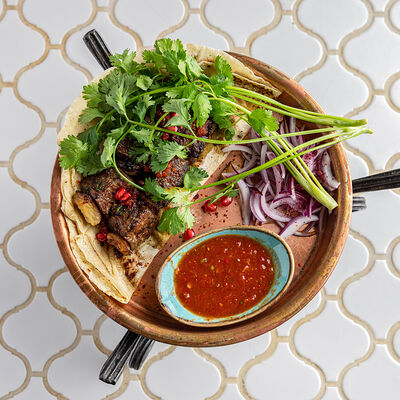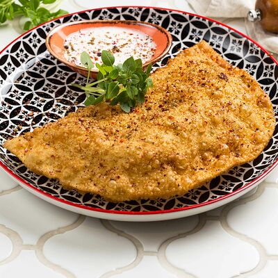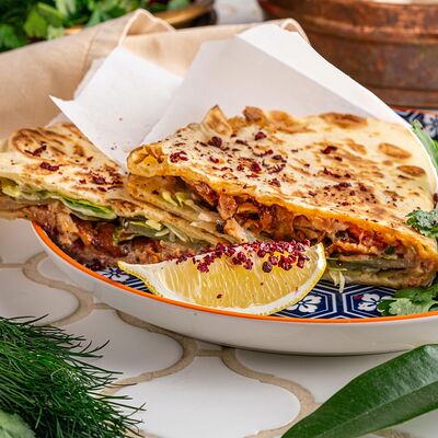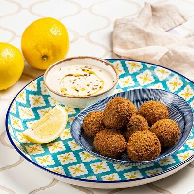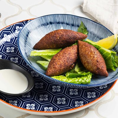 Фарш из баранины, обжаренный во фритюре, каймак, салат романо, соус цитронет, лимон, сумах
