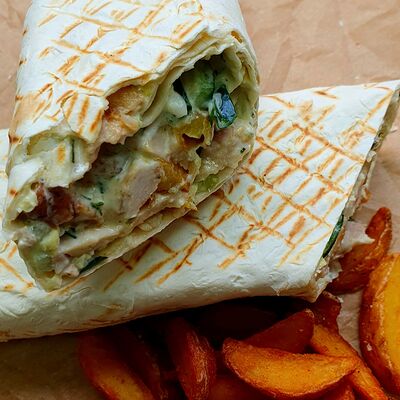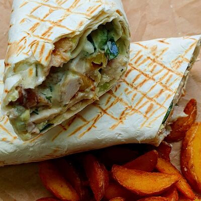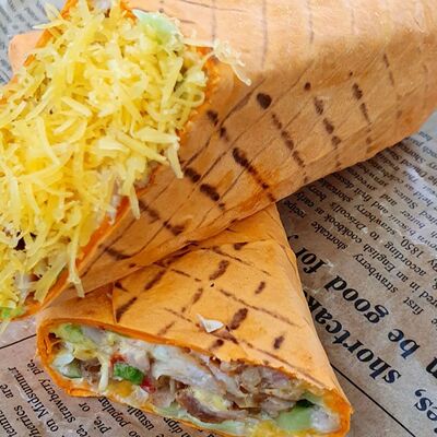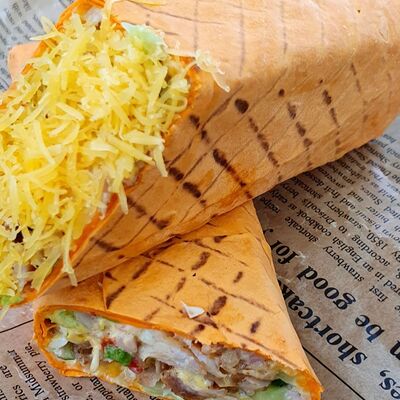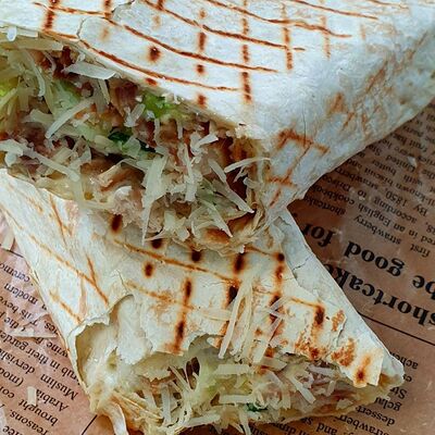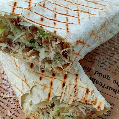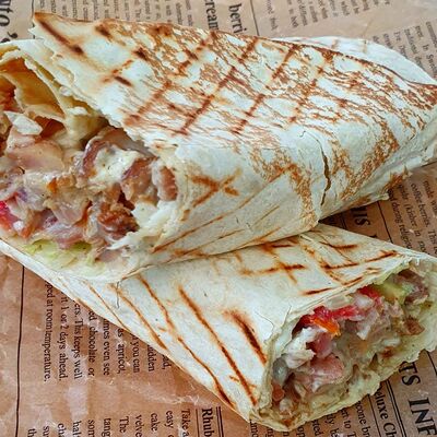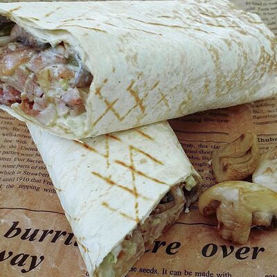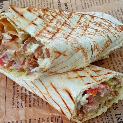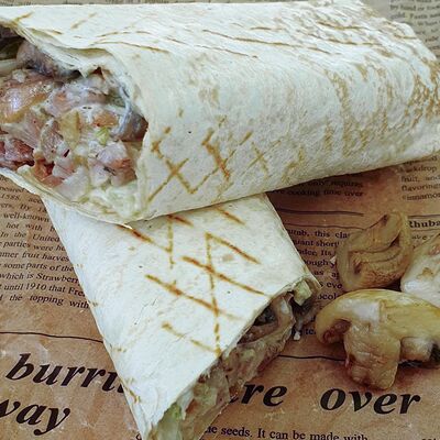 Лаваш, мясо куриное, соус фирменный, листья салата, огурцы свежие, огурцы соленые, лук красный, шампиньоны жареные