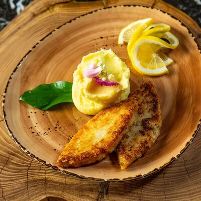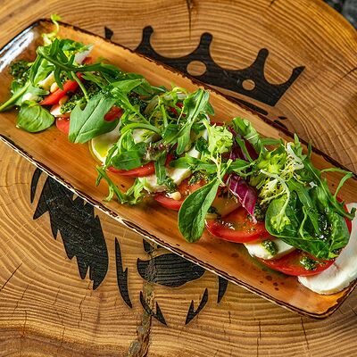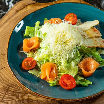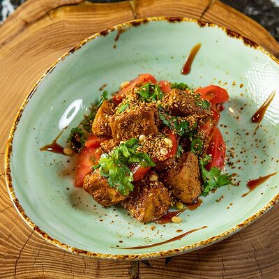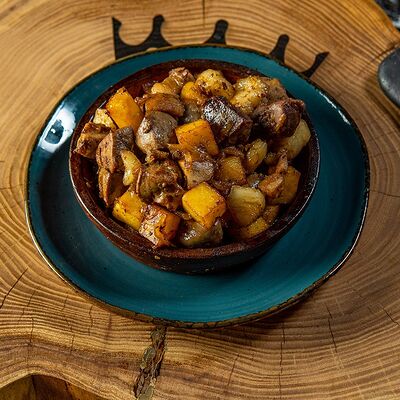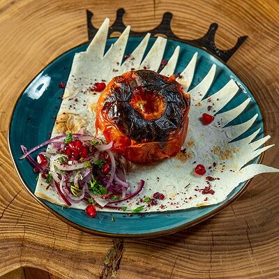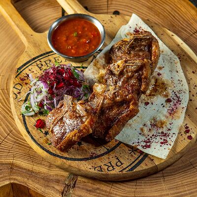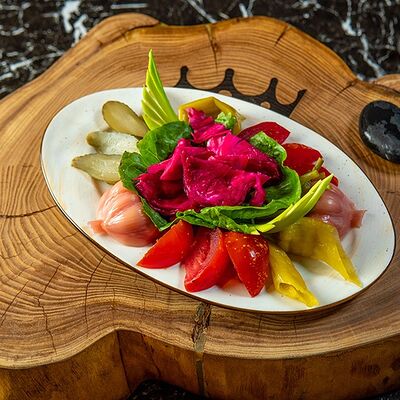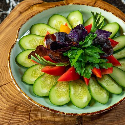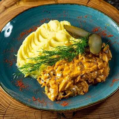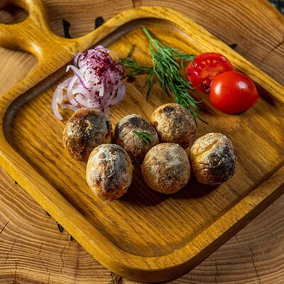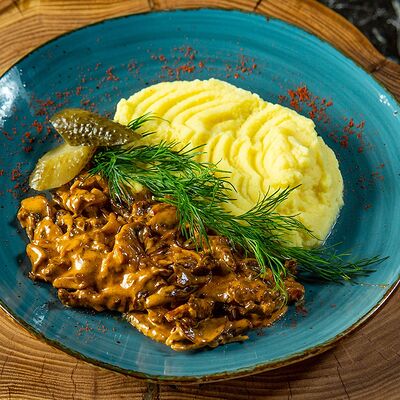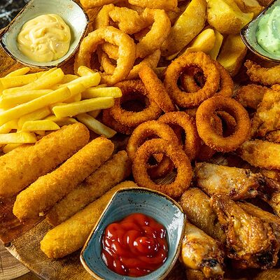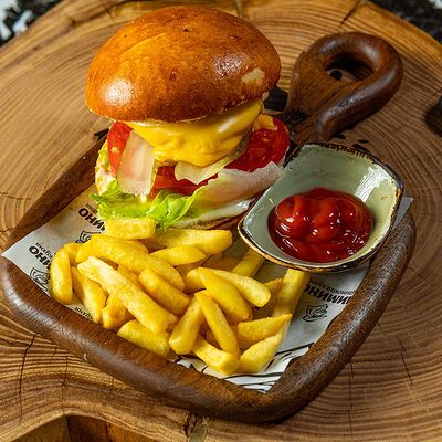 Булочка, котлета из говядины, сыр плавленый чеддер, соленые маринованные огурцы, помидор, салат айсберг, картофель фри, соус кетчуп, лук