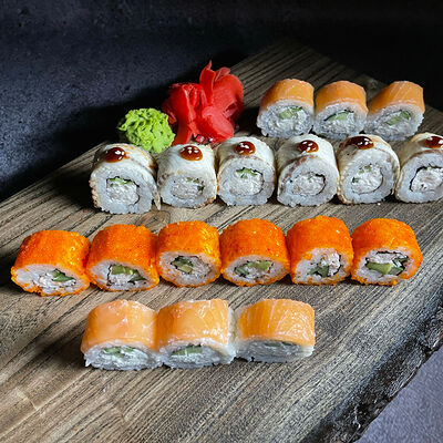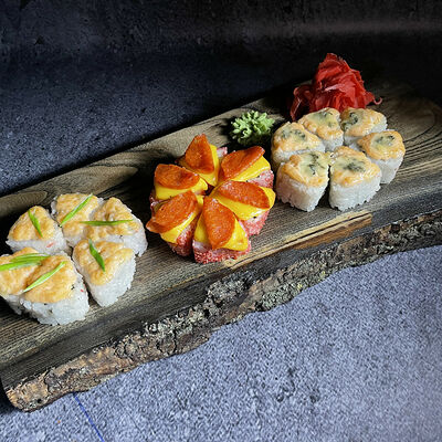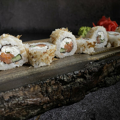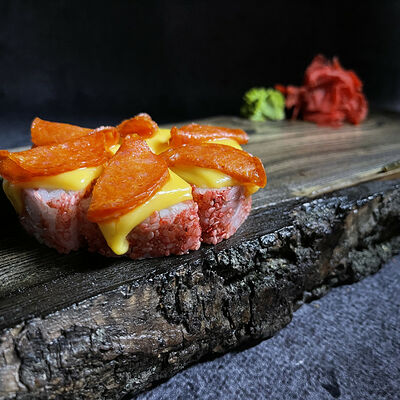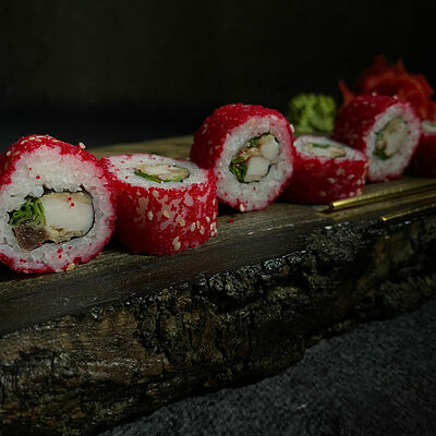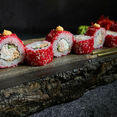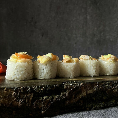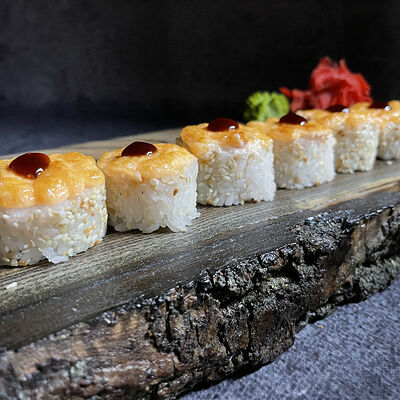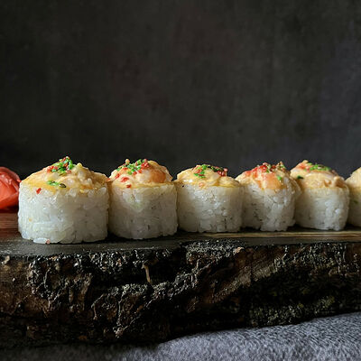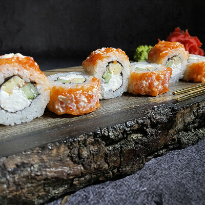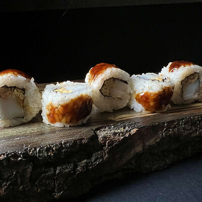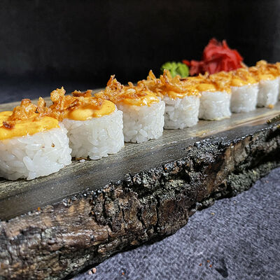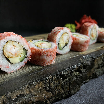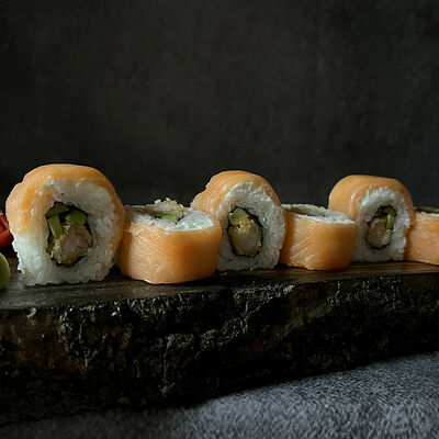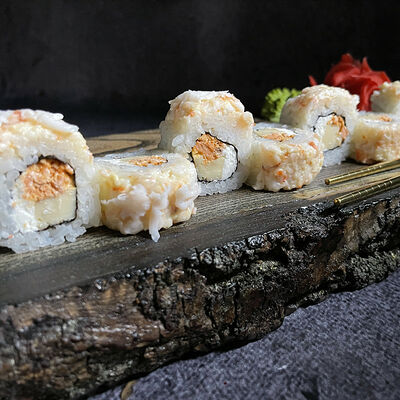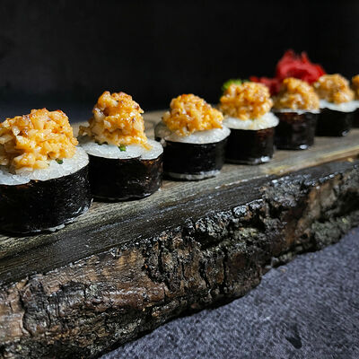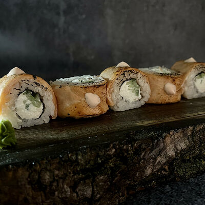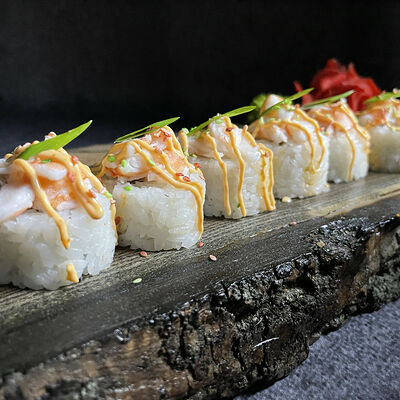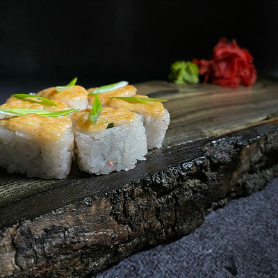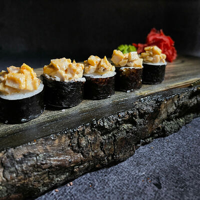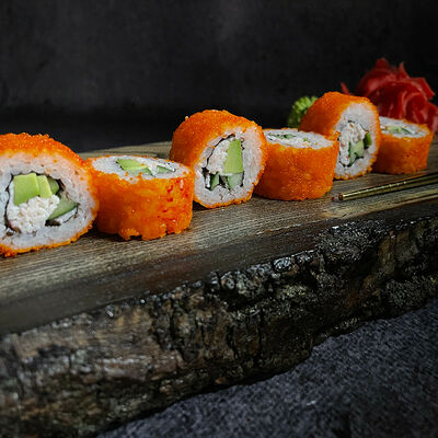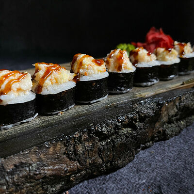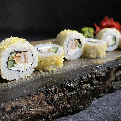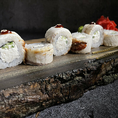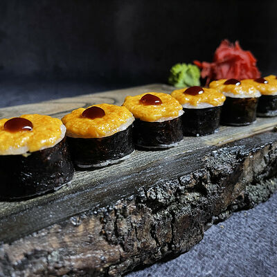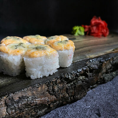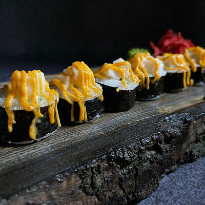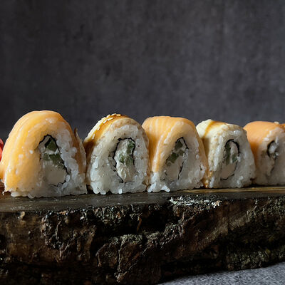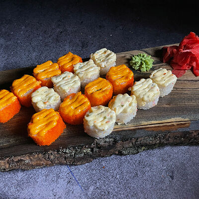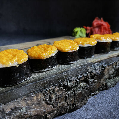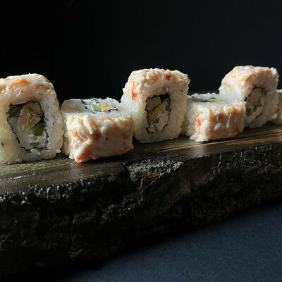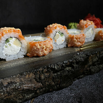 Кальмар, омлет, огурец, сливочный сыр, спайси соус, нори, рис (6 шт.)