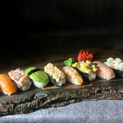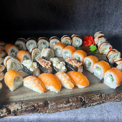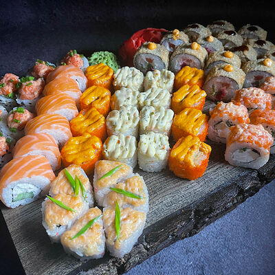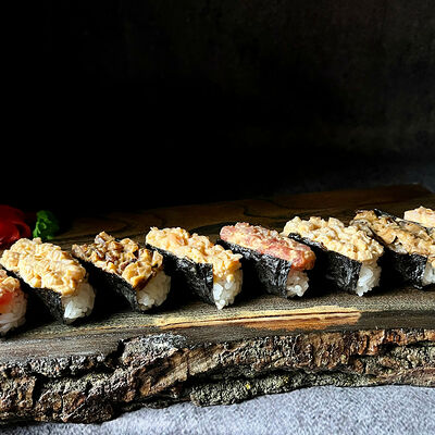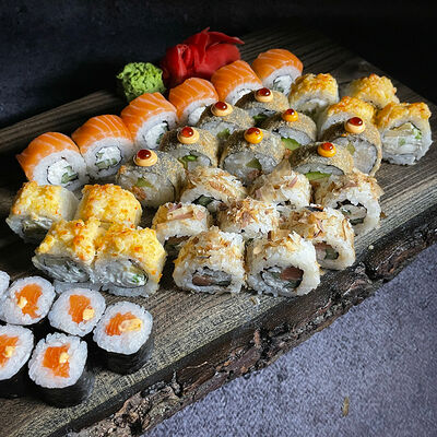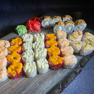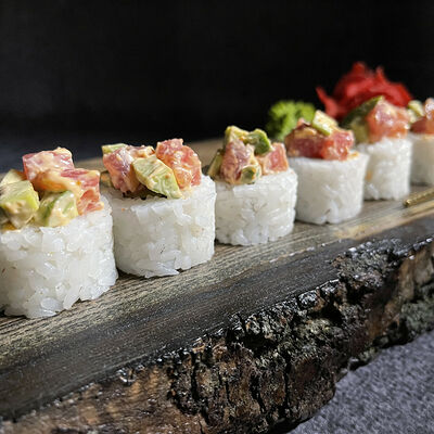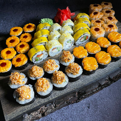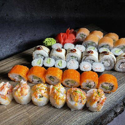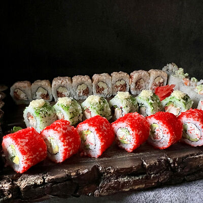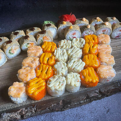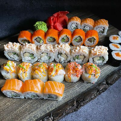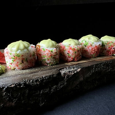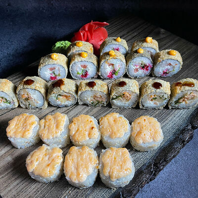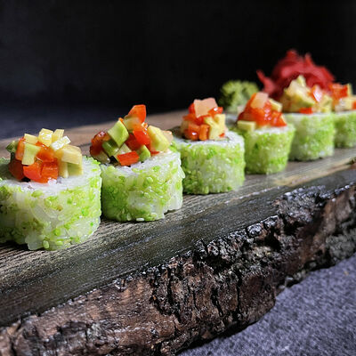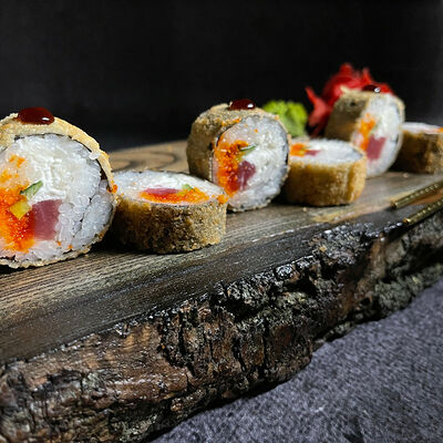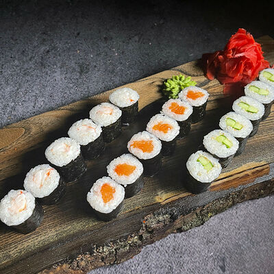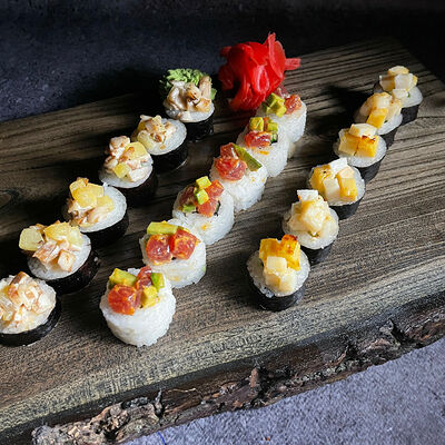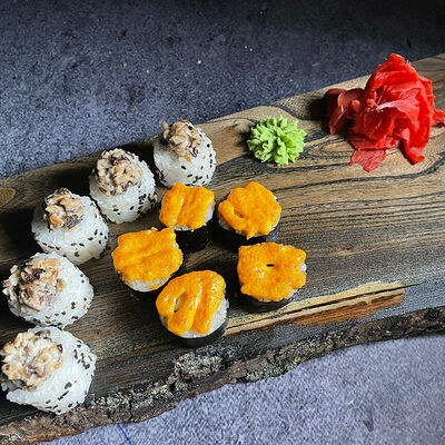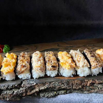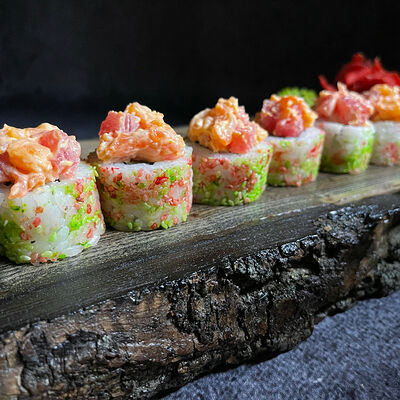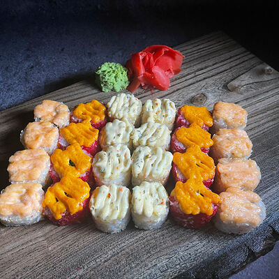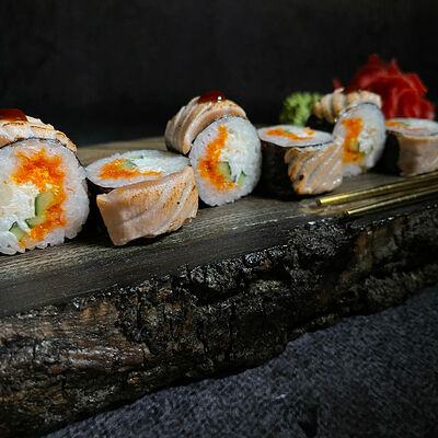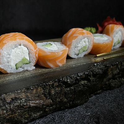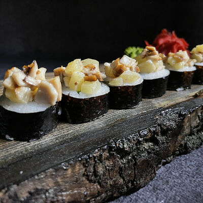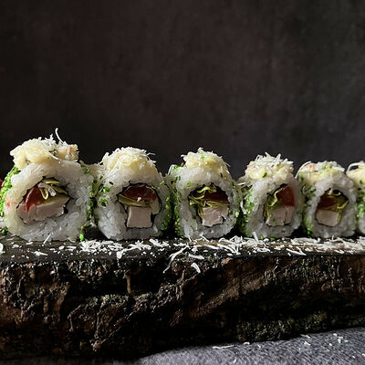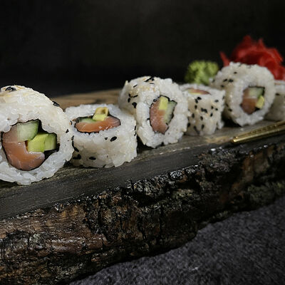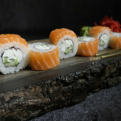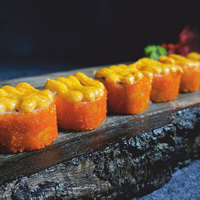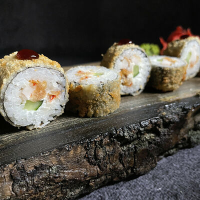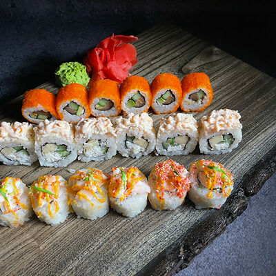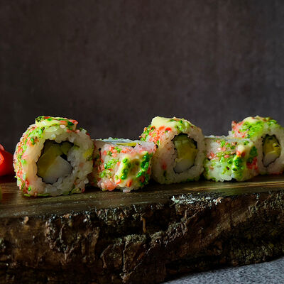 Кальмар, омлет, огурец, сливочный сыр, спайси соус, нори, рис (6 шт.)