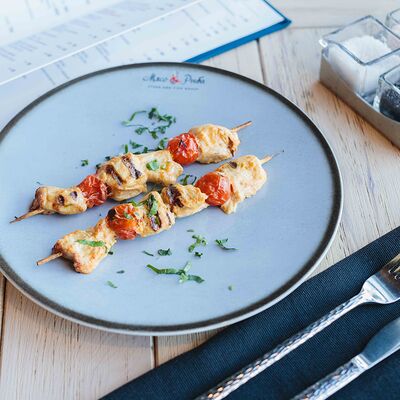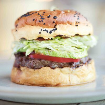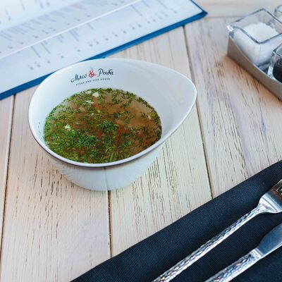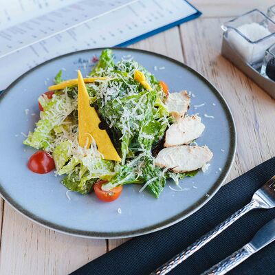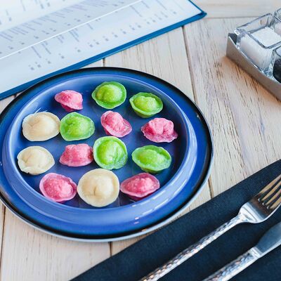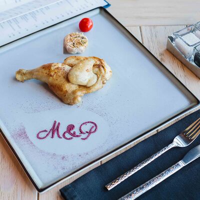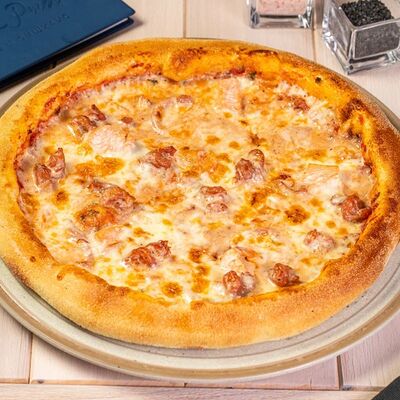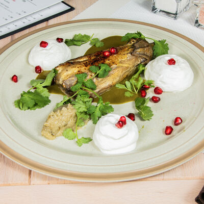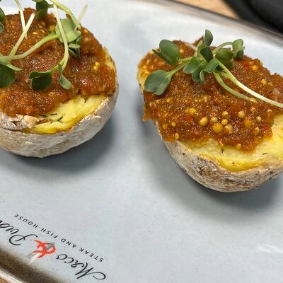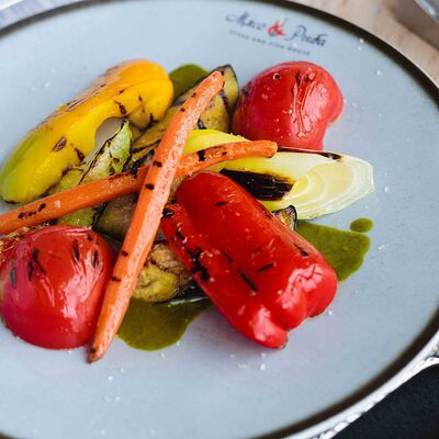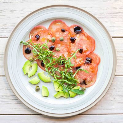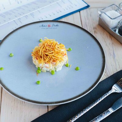 Мясо камчатского краба смешивают с нарезанным кубиками авокадо и заправляют имбирным соусом. Чавычу, нарезанную кубиками, заправленную соусом халапеньо выкладывают сверху. Украшают листьями шпината, японского щавеля и кинзы (предварительно заправленные салатной заправкой)