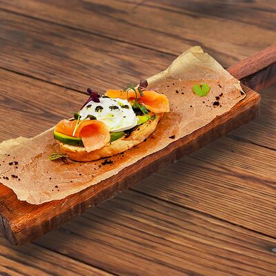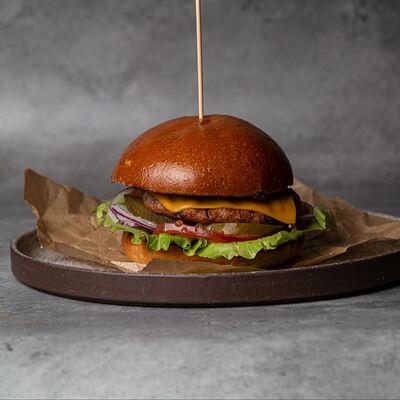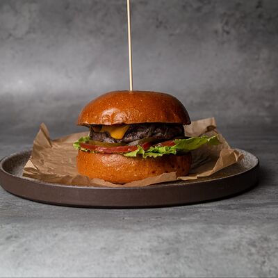 Булочка, говяжья котлета, сыр чеддер, лист салата, помидор, маринованный огурец, лук фри, куриное яйцо, соус медово-горчичный