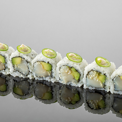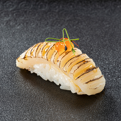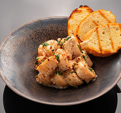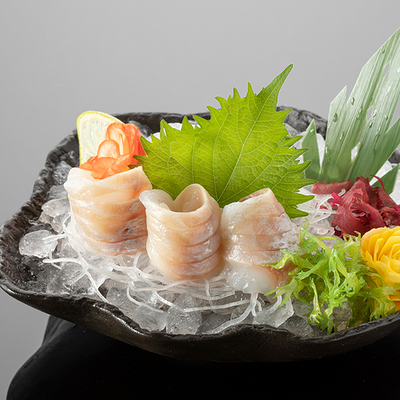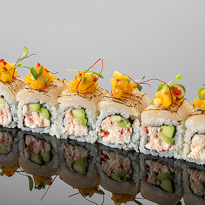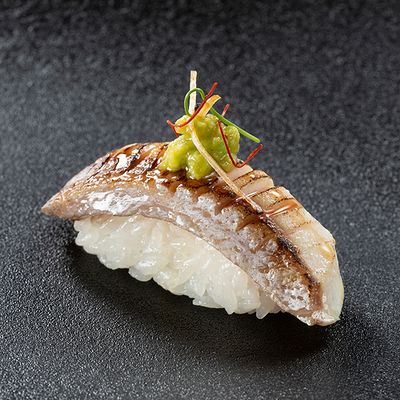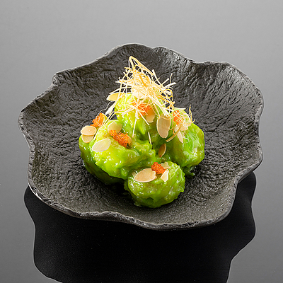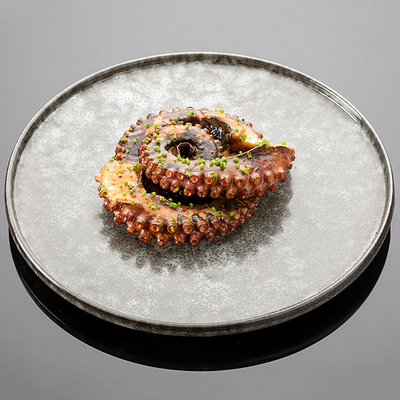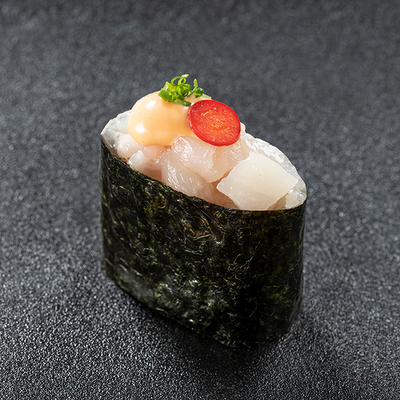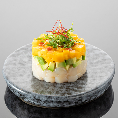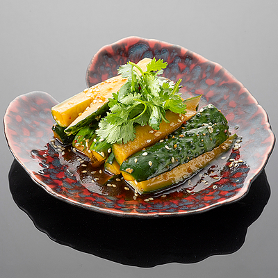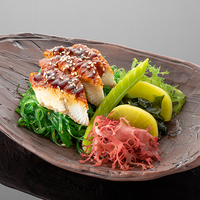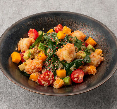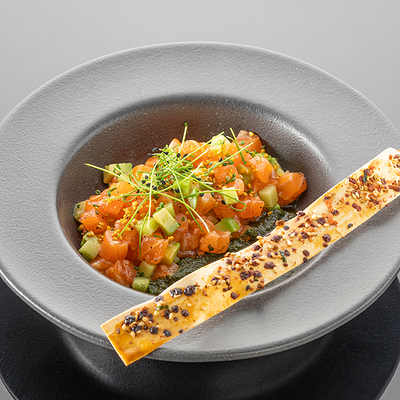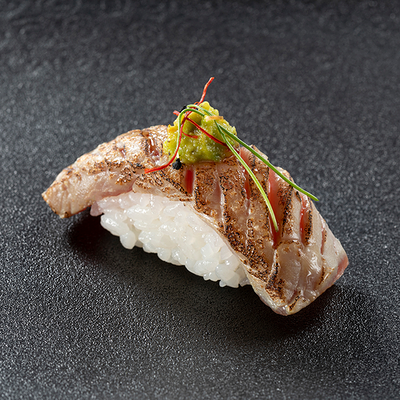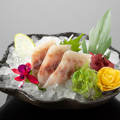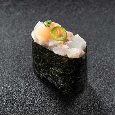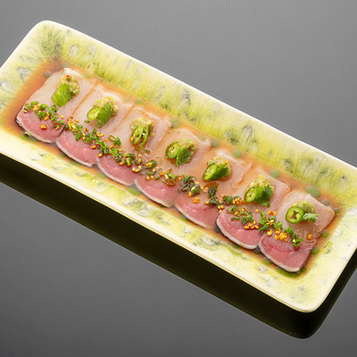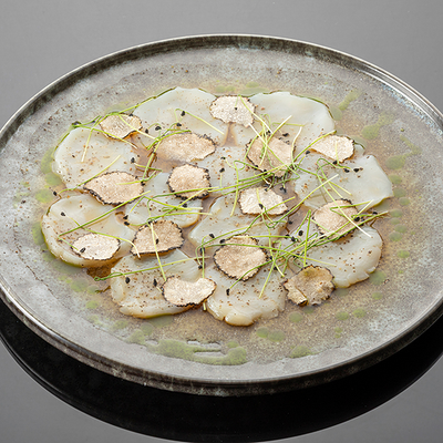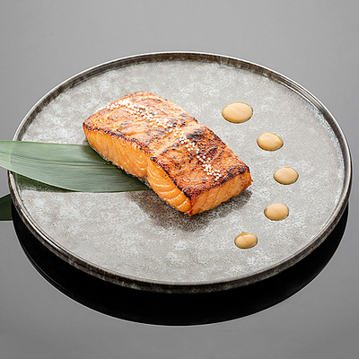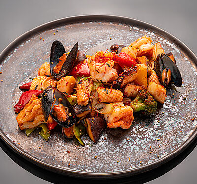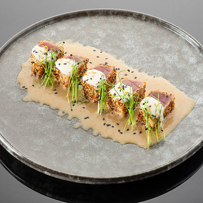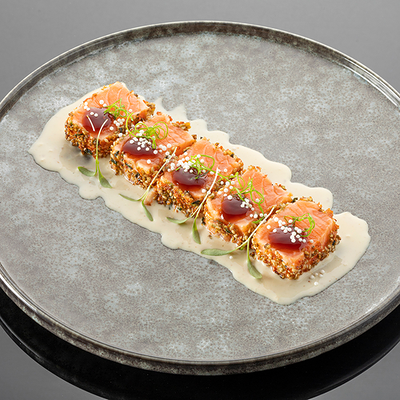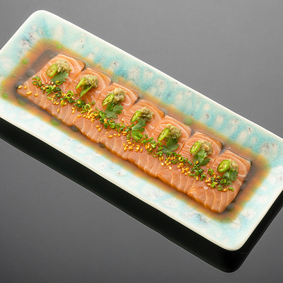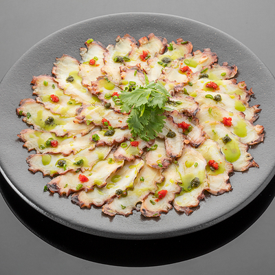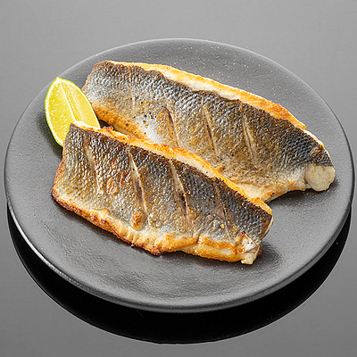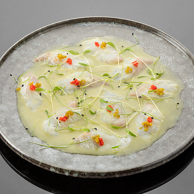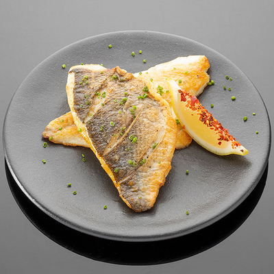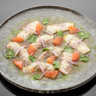 Сибас, соус фирменный, масло базиликовое, грейпфрут, лук красный, кинза