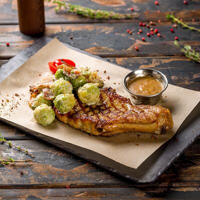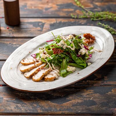 Филе индейки с салатным миксом, печеной свеклой и сыром дорблю. Приправляется соусом и грецким орехом