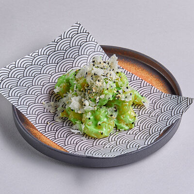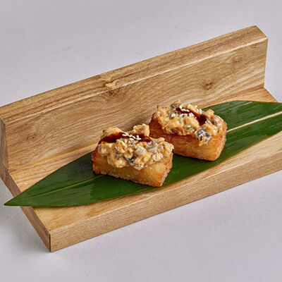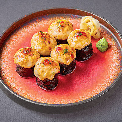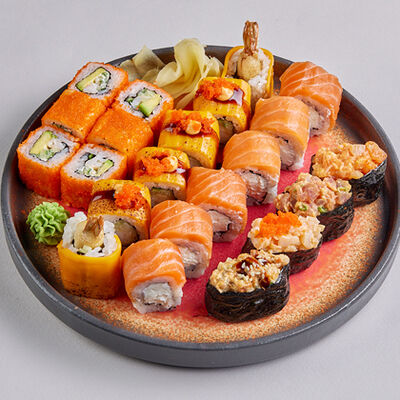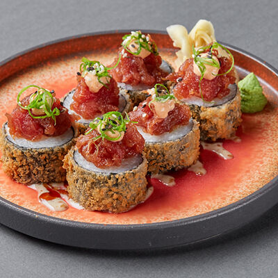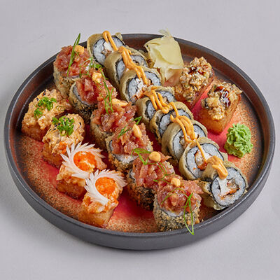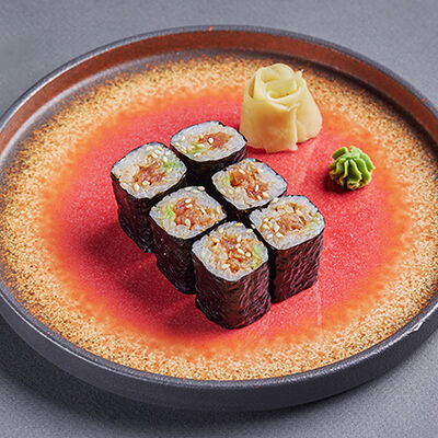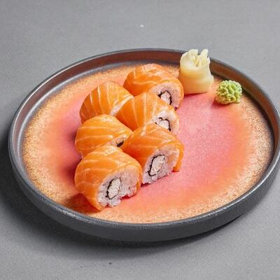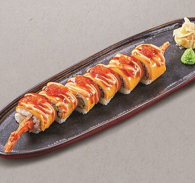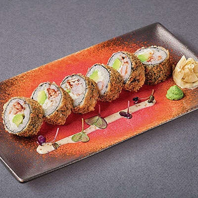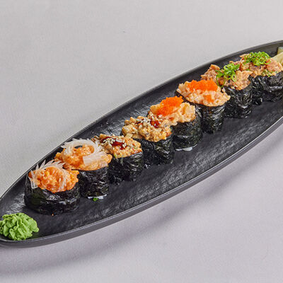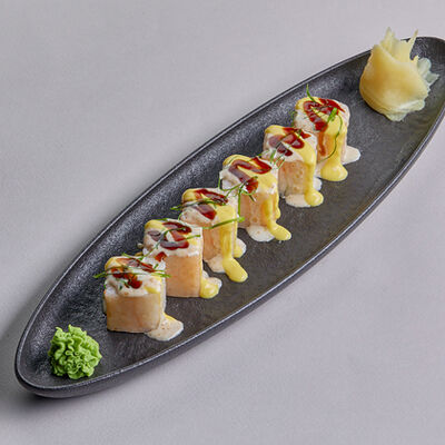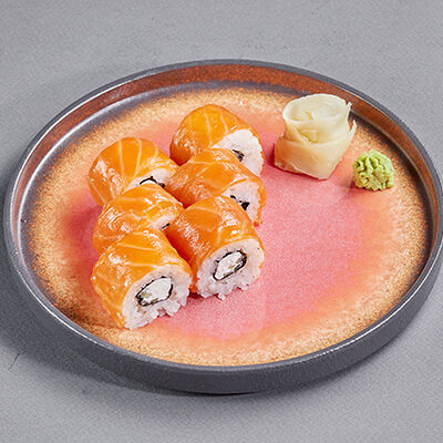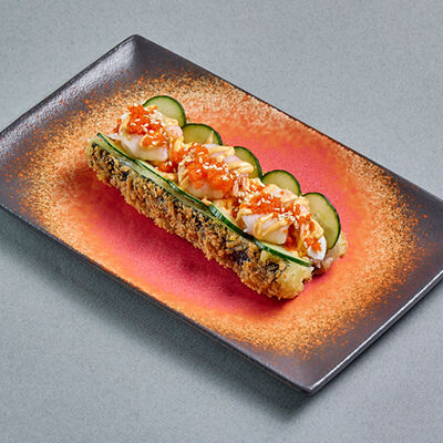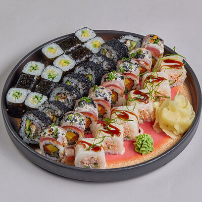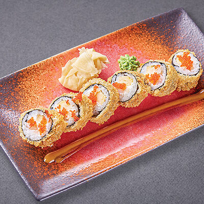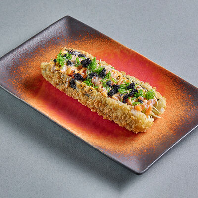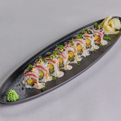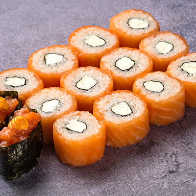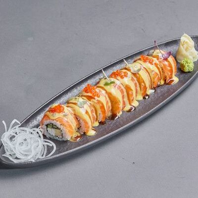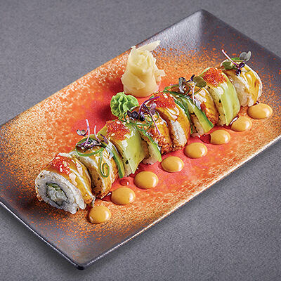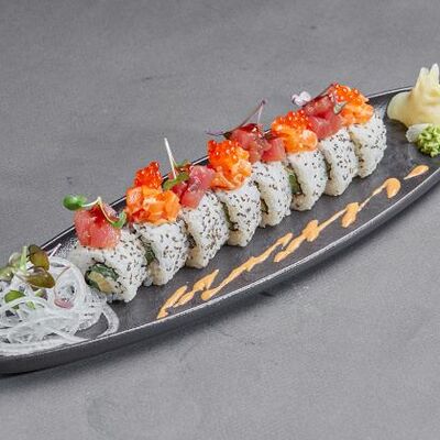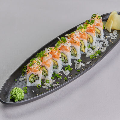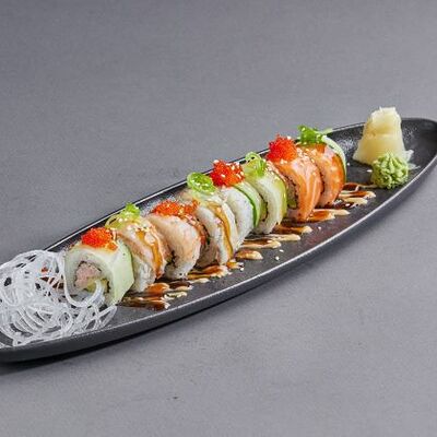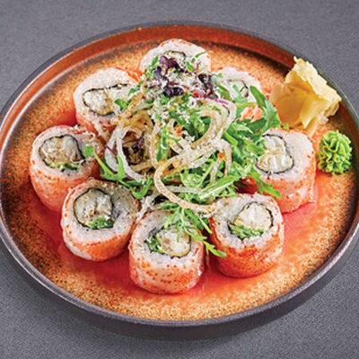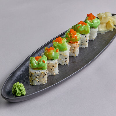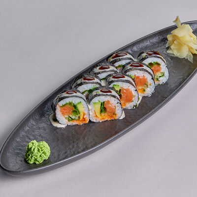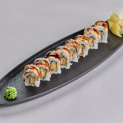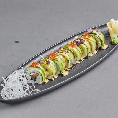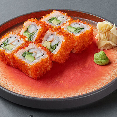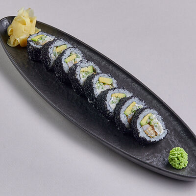 Чёрным по белому: копчёный угорь, креветки, сливочный сыр, авокадо, рис и икра масаго