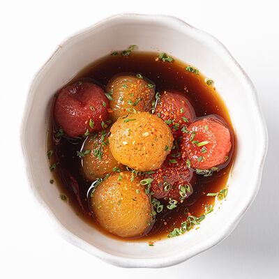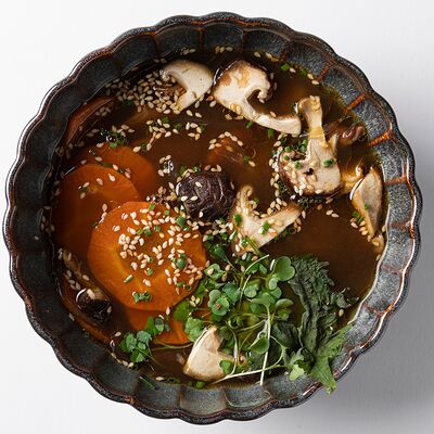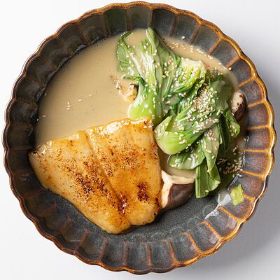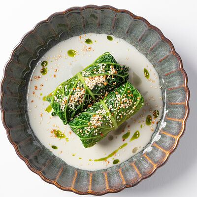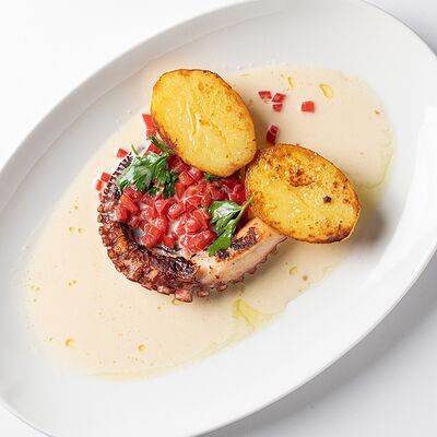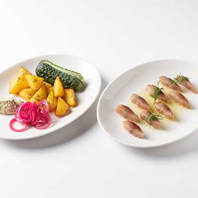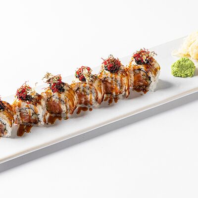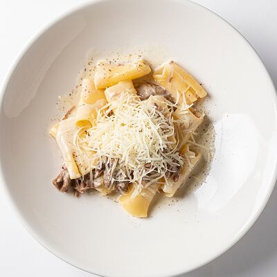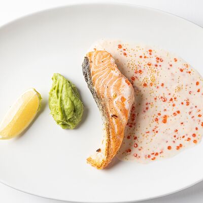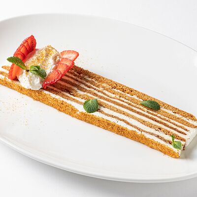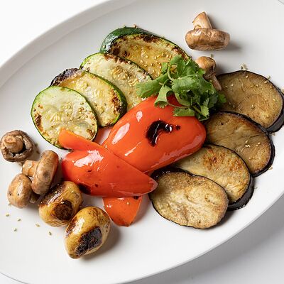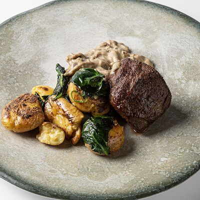 Говяжья вырезка, розмарин, чеснок, сливочное масло, шпинат, беби-картофель, соус грибной, вешенки
