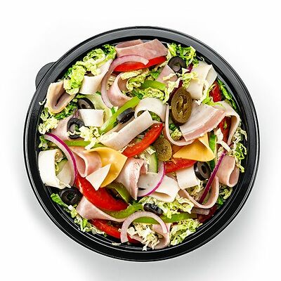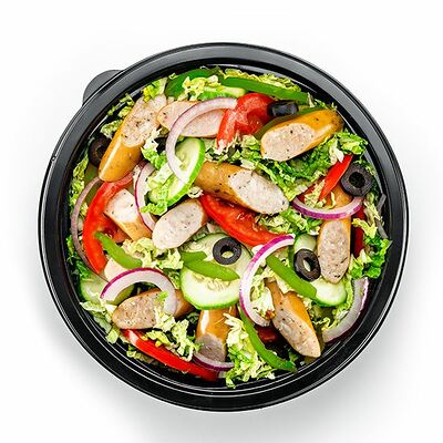 Легкий овощной сэндвич из сочных листьев салата, спелых помидоров, свежих и маринованных огурцов, оливок, лука и зеленого перца с соусом на выбор