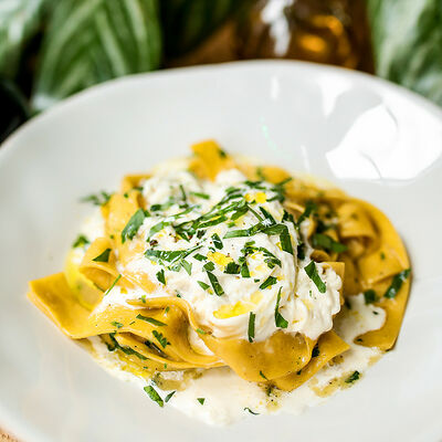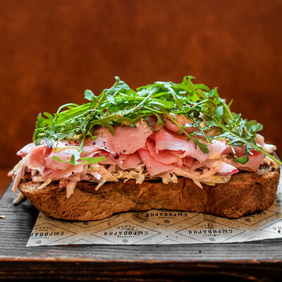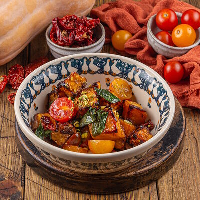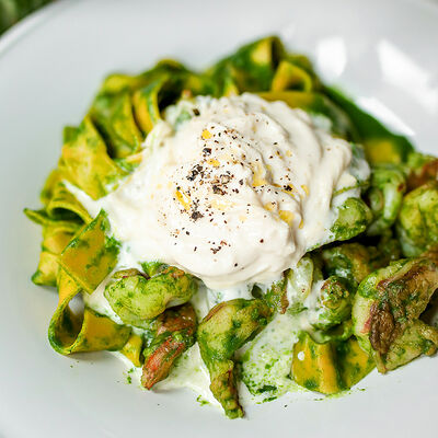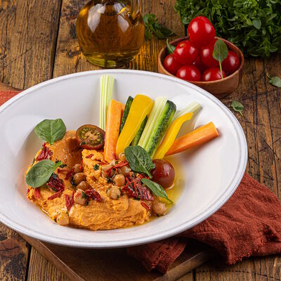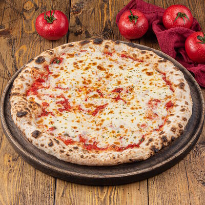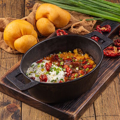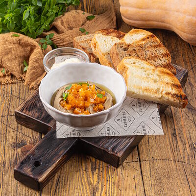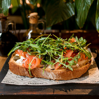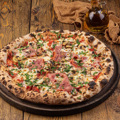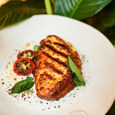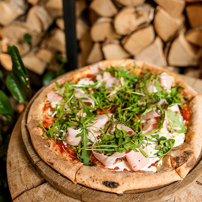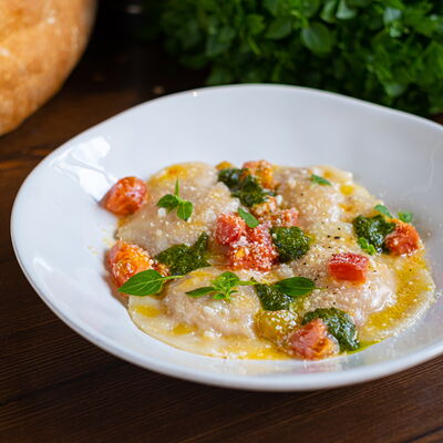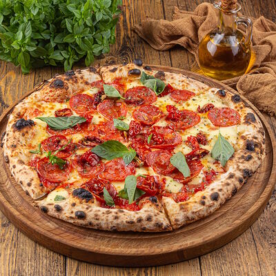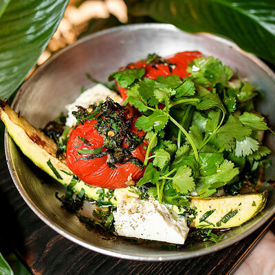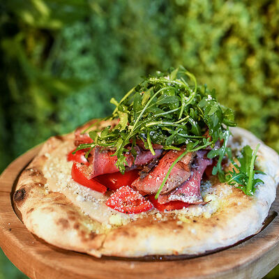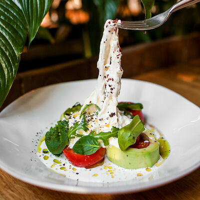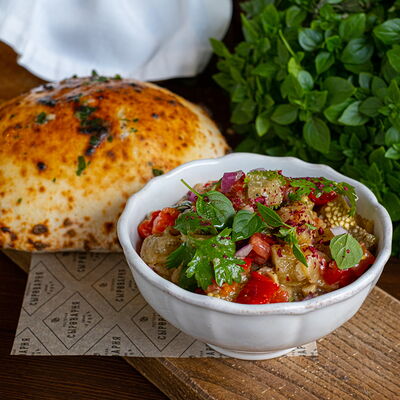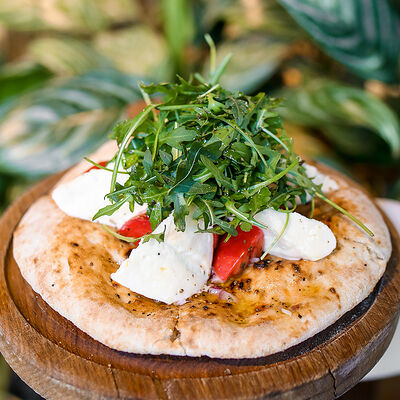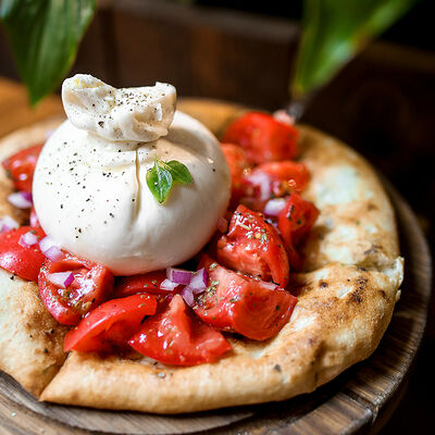 Фокачча из дровяной печи с нежной домашней Страчателлой, сладкими узбекскими помидорами, запеченным красным перцем и россыпью измельченных фисташек и мятой