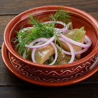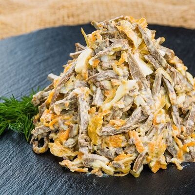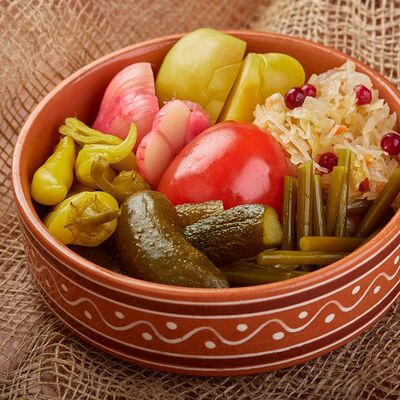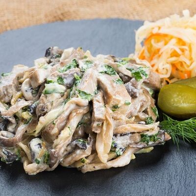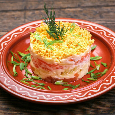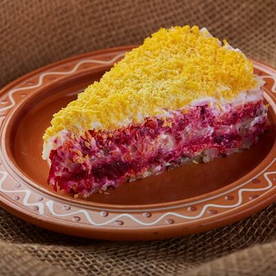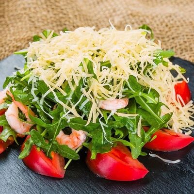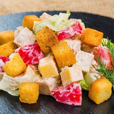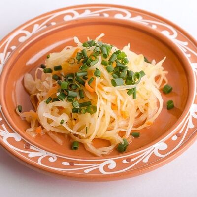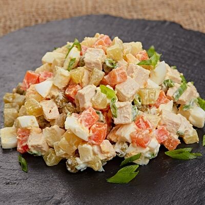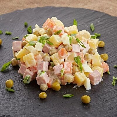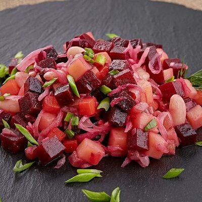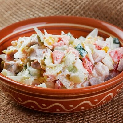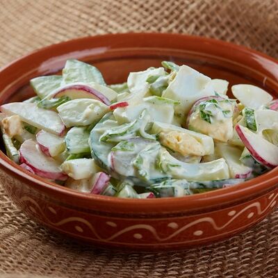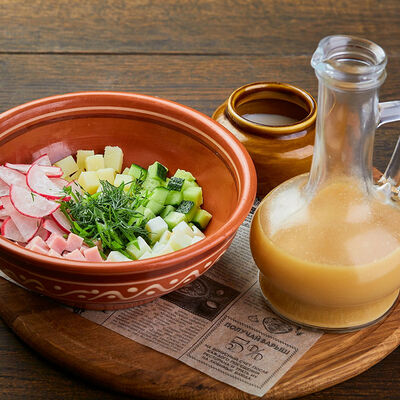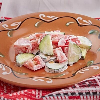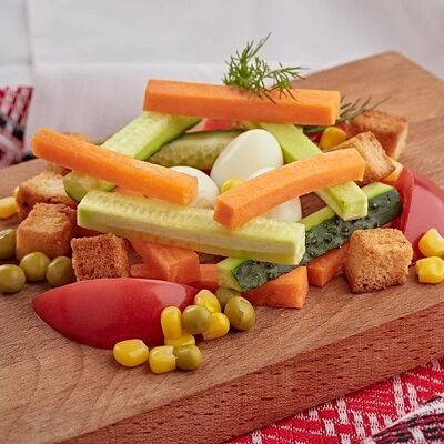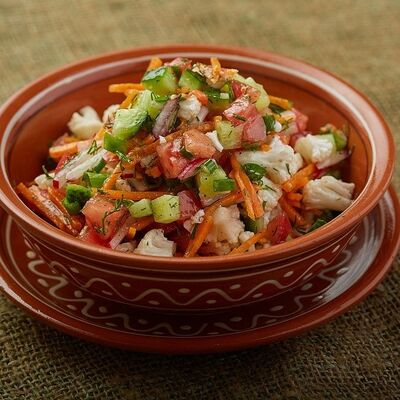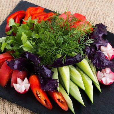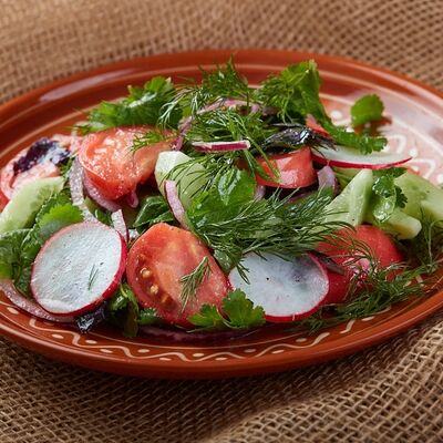Из свежих огурцов, помидоров, редиса, красного репчатого лука, кинзы, укропа, базилика. Заправляется маслом душистым