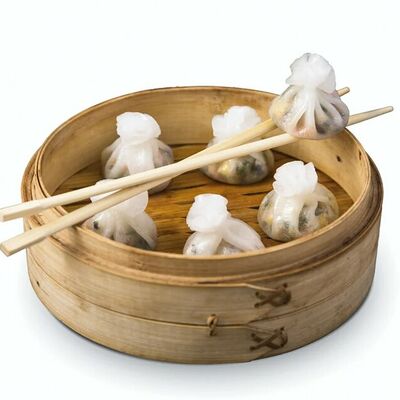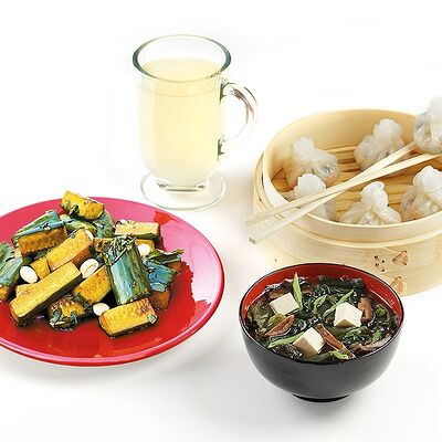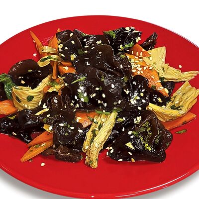 Микс свежих овощей из зеленой фасоль, моркови, белой и цветной капусты, болгарского перца, шампиньонов с омлетом из куриных яиц и растительного масла обжаренные с древесными грибами и шиитаке в очень остром соусе Жаркая Азия
