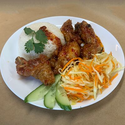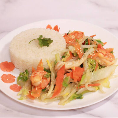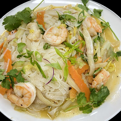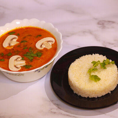 Кокосовое молоко, куриный бульон, морепродукты (креветки и кальмар), шампиньоны, древесные грибы, томаты. Подается с рисом