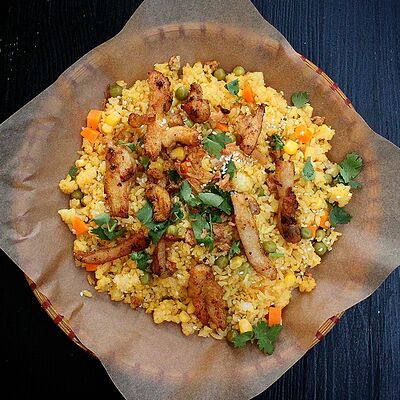 Жареный рис, курица, морковь, кукуруза, горох, лук