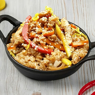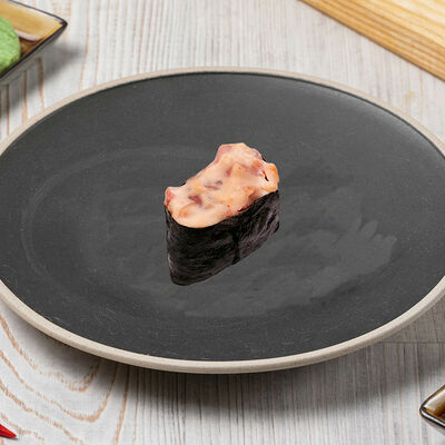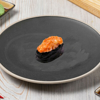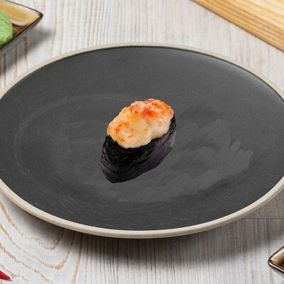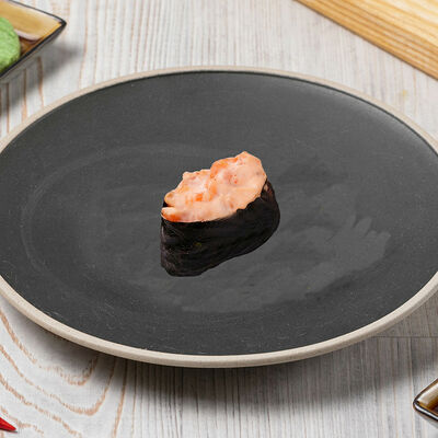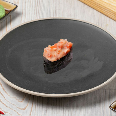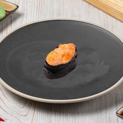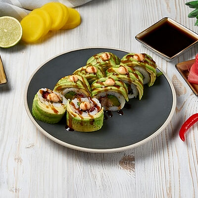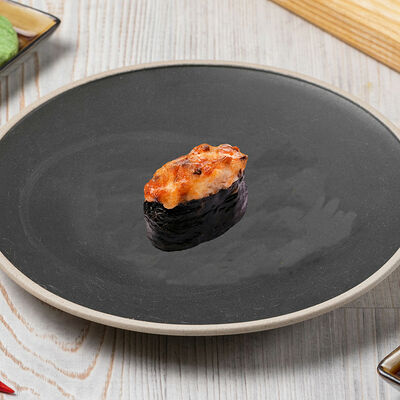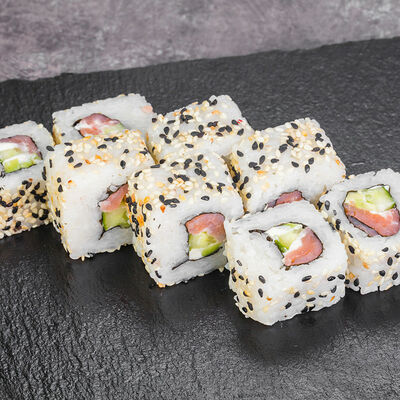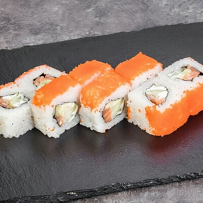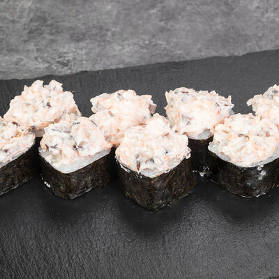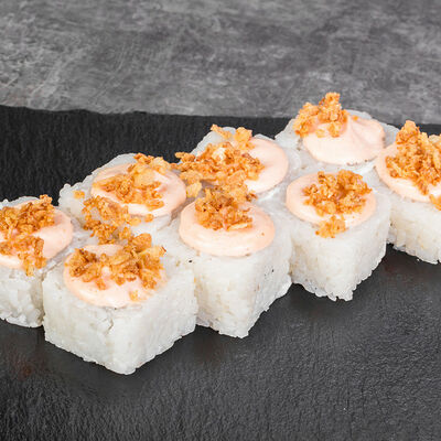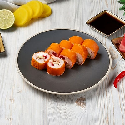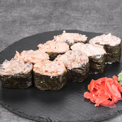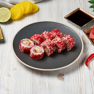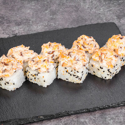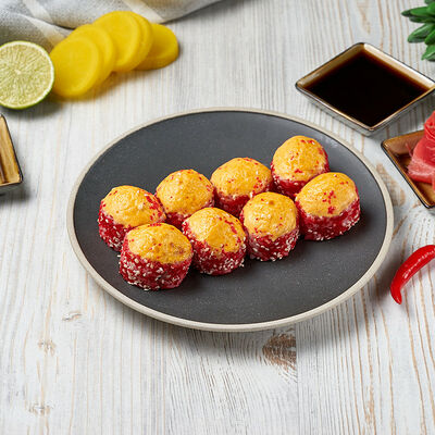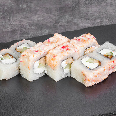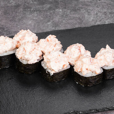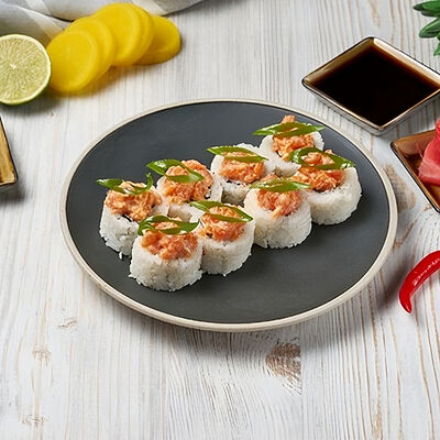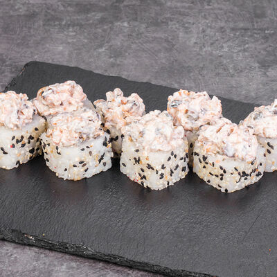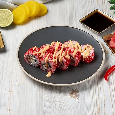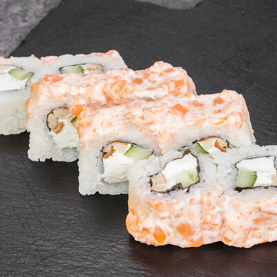 Краб снежный, лосось терияки, огурец, сыр сливочный, соус спайси, масаго, кунжут, нори, рис