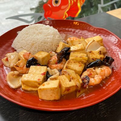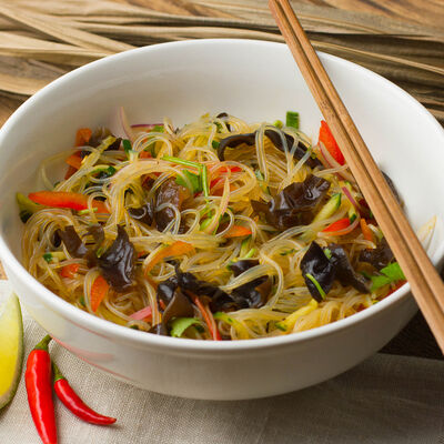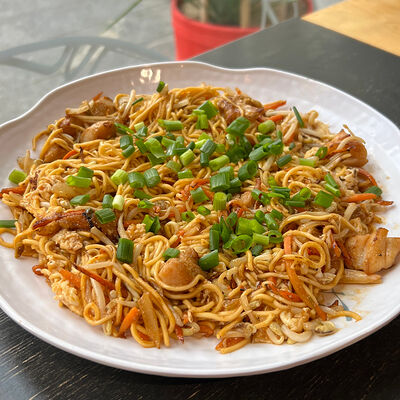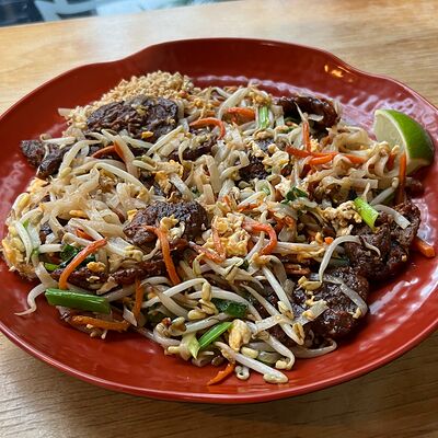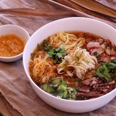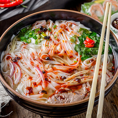 Рисовая лапша, говяжий бульон, говядина, зелень, ростки сои