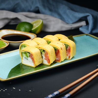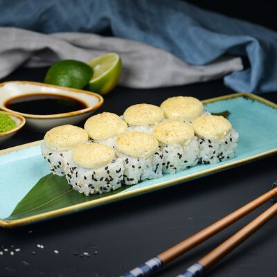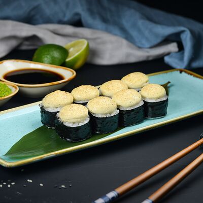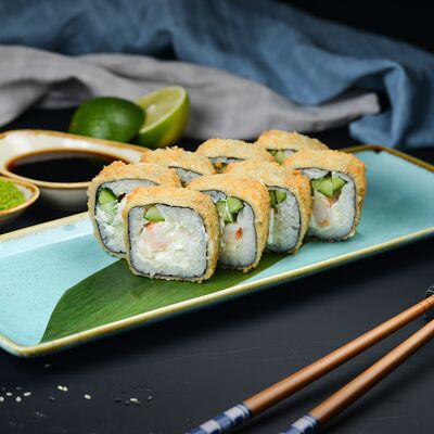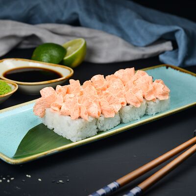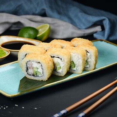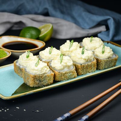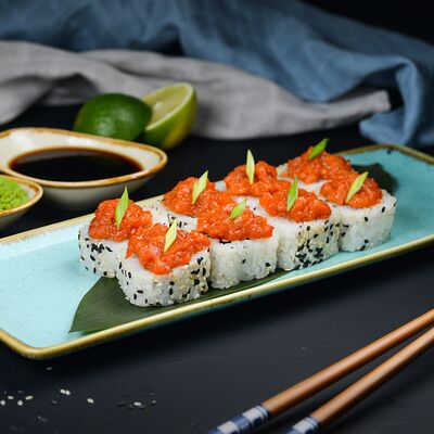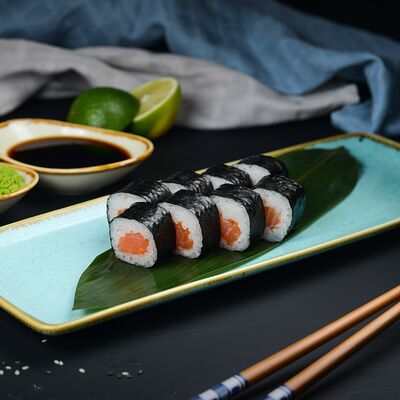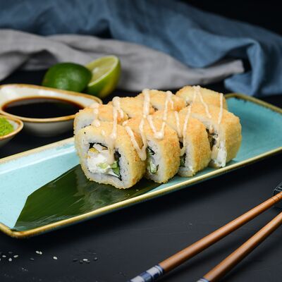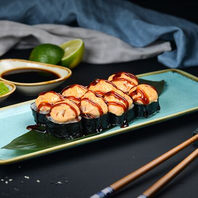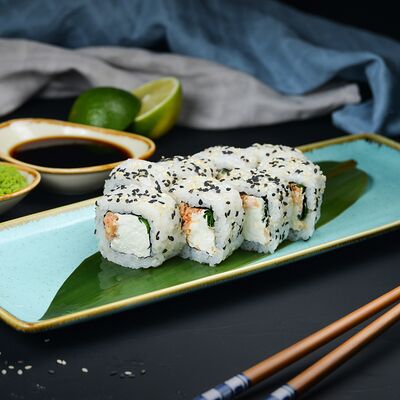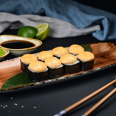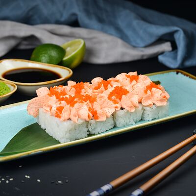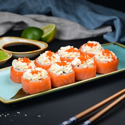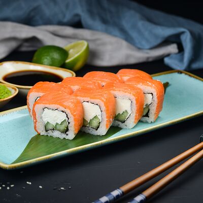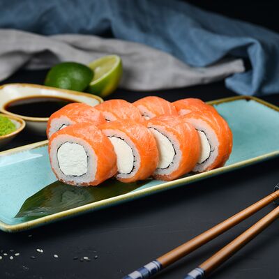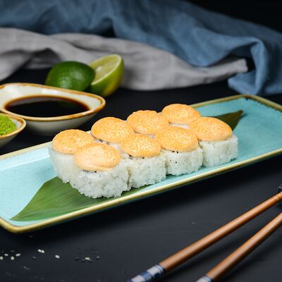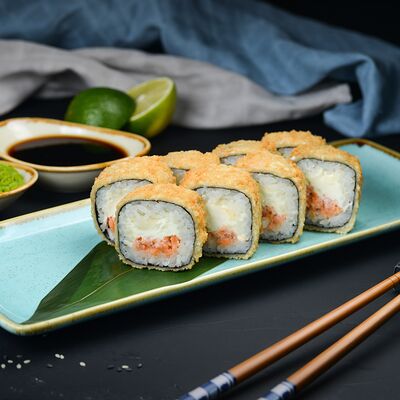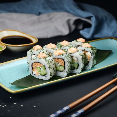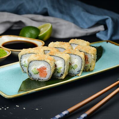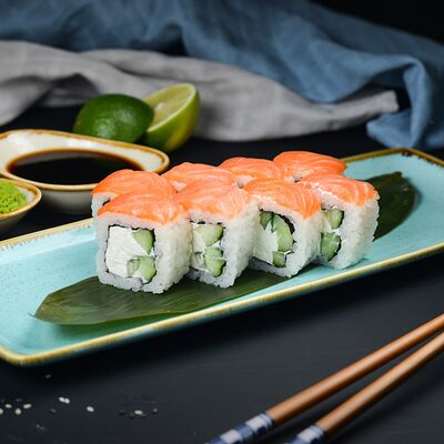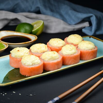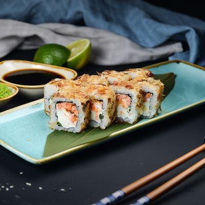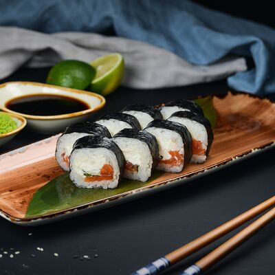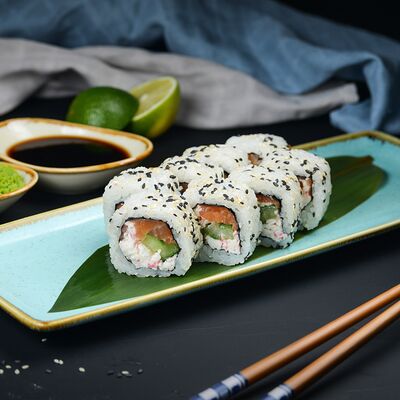 Рис, нори, жареный лосось, огурец, кунжут, соус сливочно-чесночный. Имбирь, васаби, соевый соус и палочки заказываются отдельно