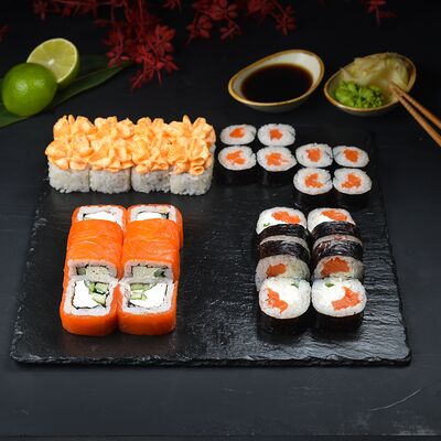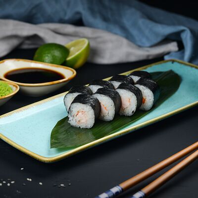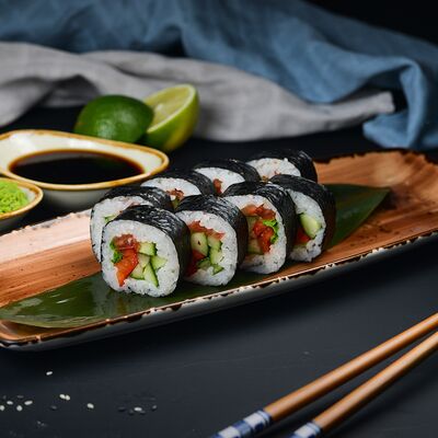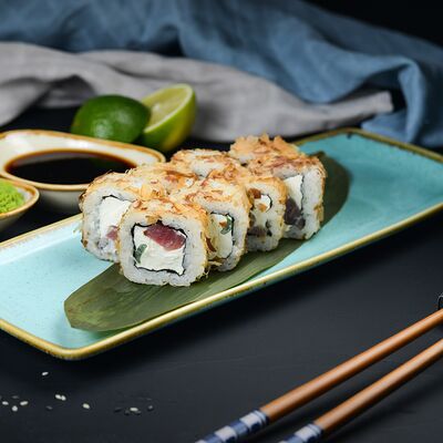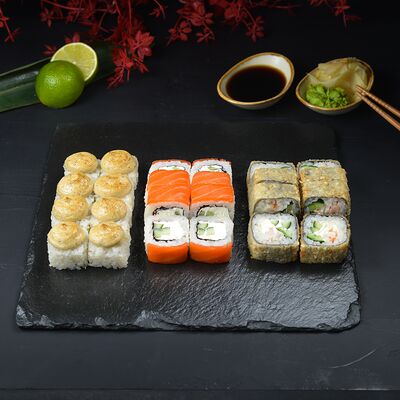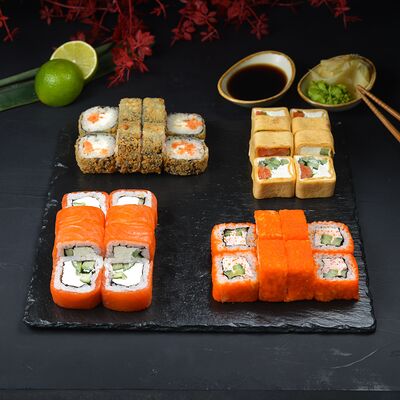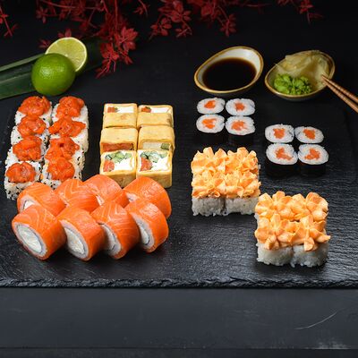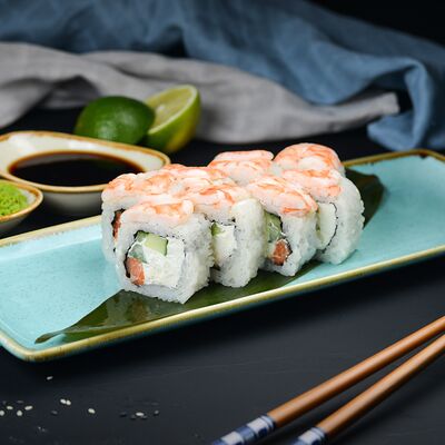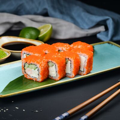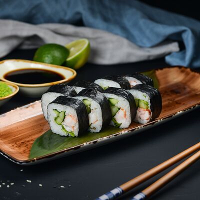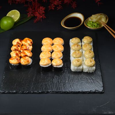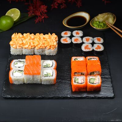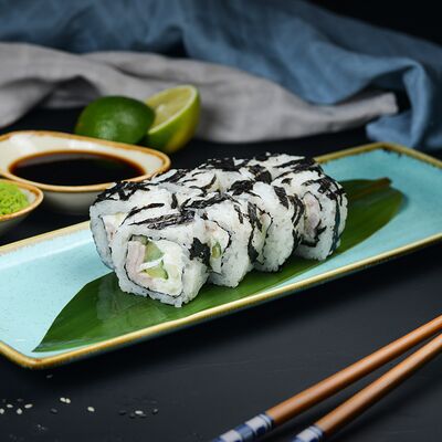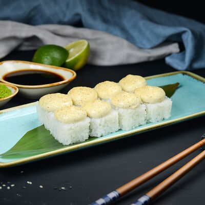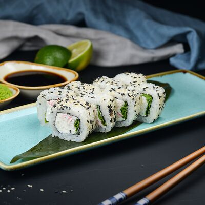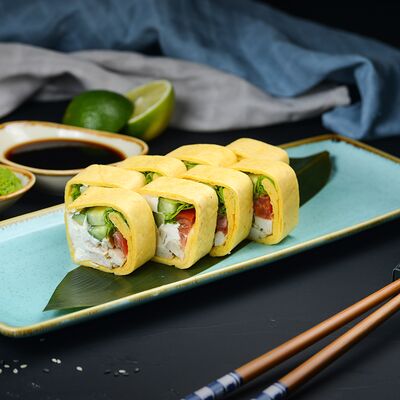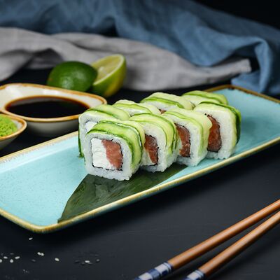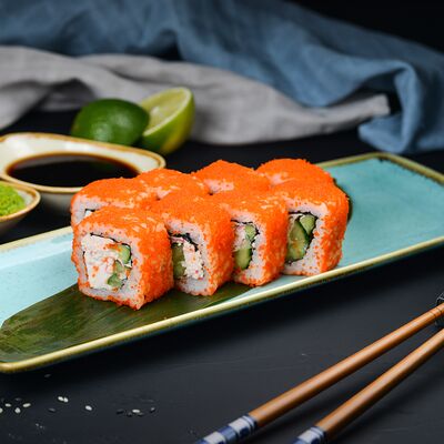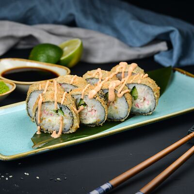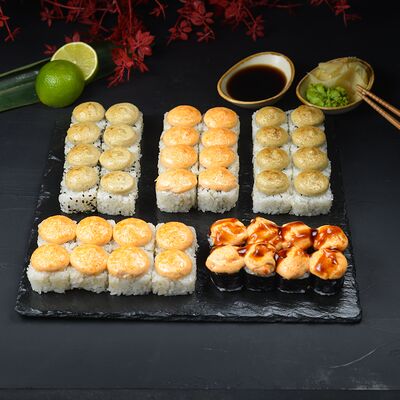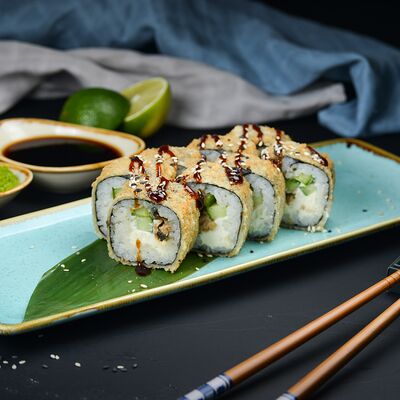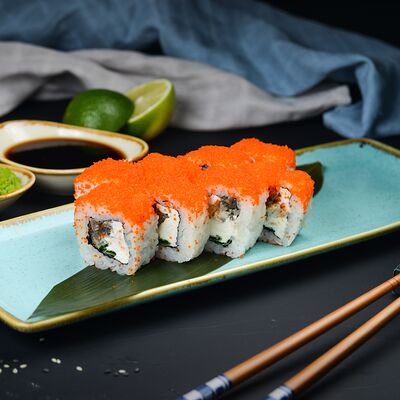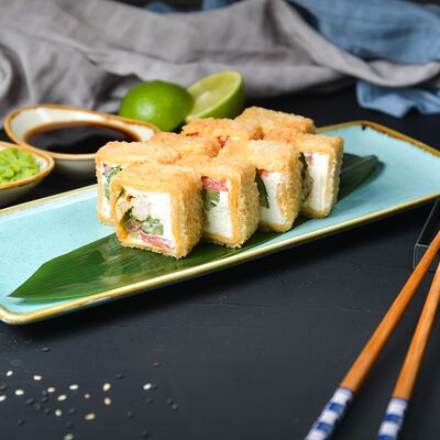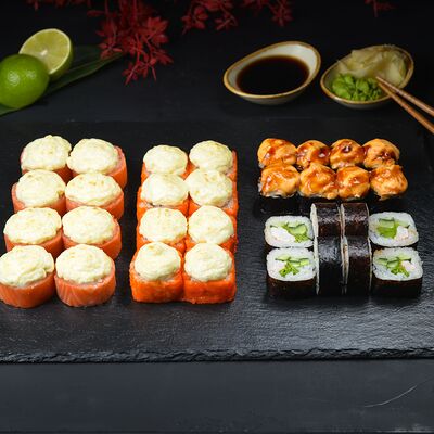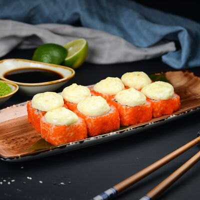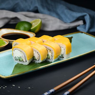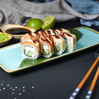 Рис, нори, жареный лосось, огурец, кунжут, соус сливочно-чесночный. Имбирь, васаби, соевый соус и палочки заказываются отдельно
