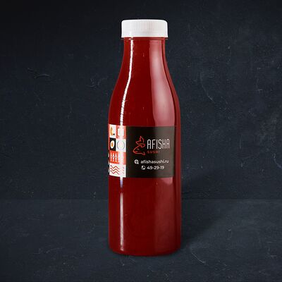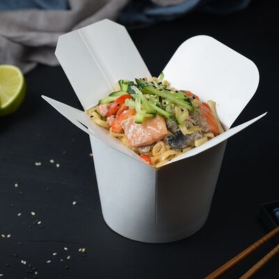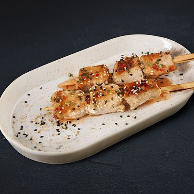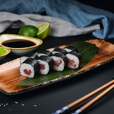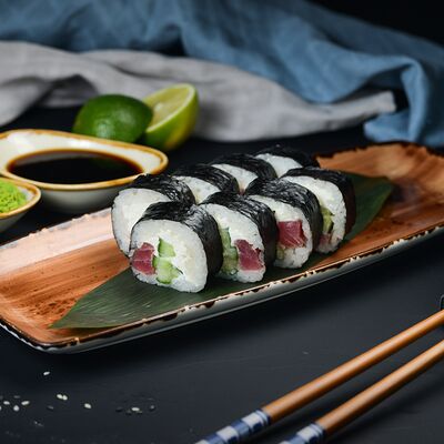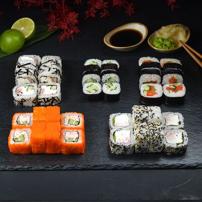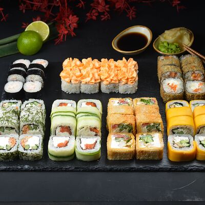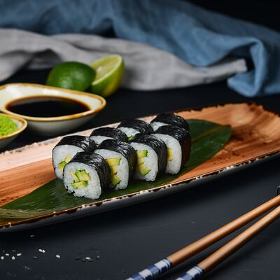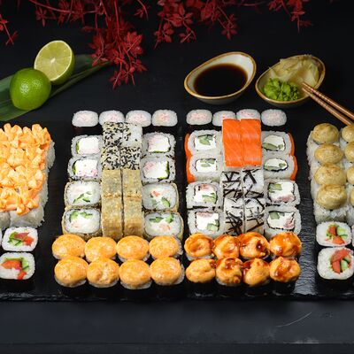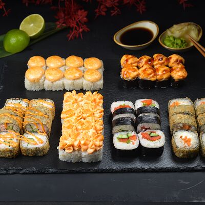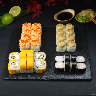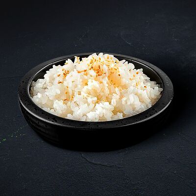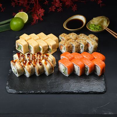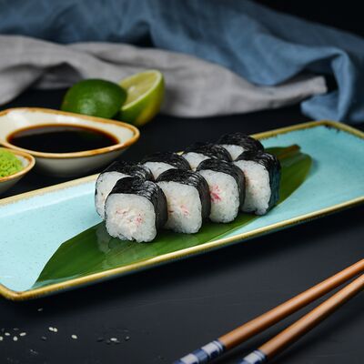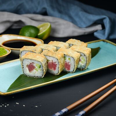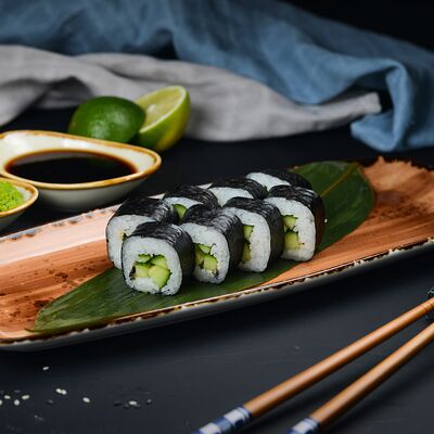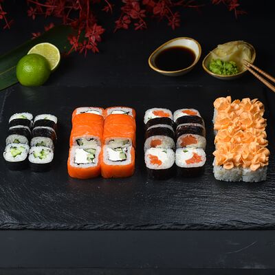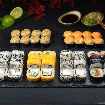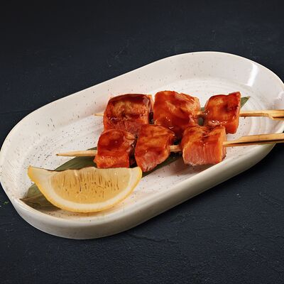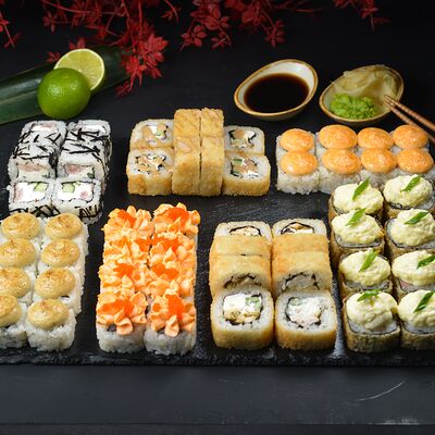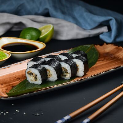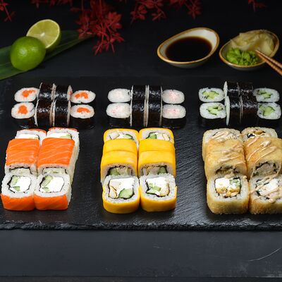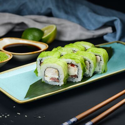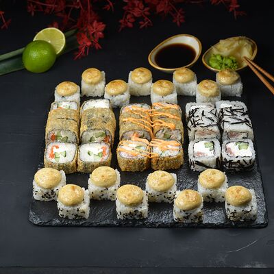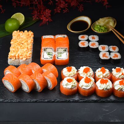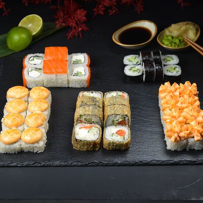 Рис, нори, жареный лосось, огурец, кунжут, соус сливочно-чесночный. Имбирь, васаби, соевый соус и палочки заказываются отдельно