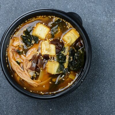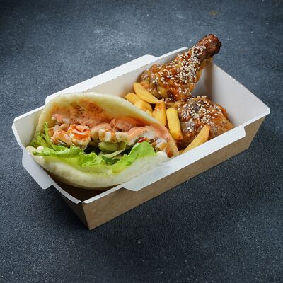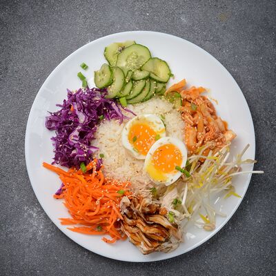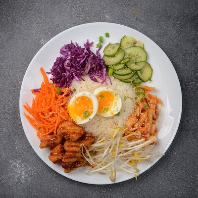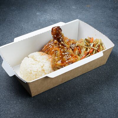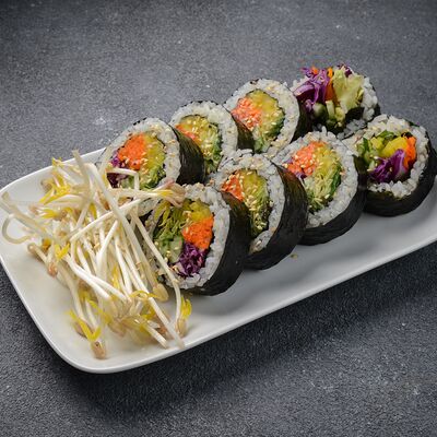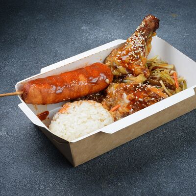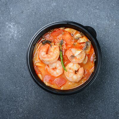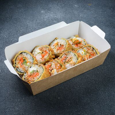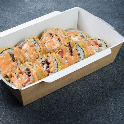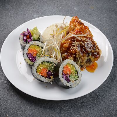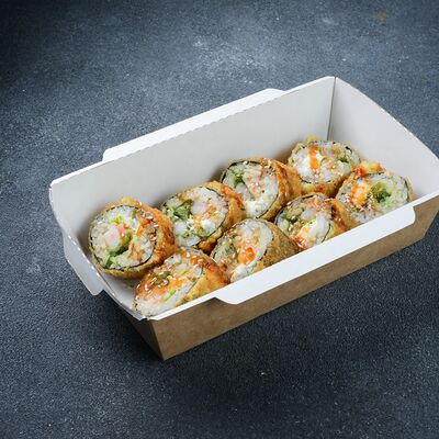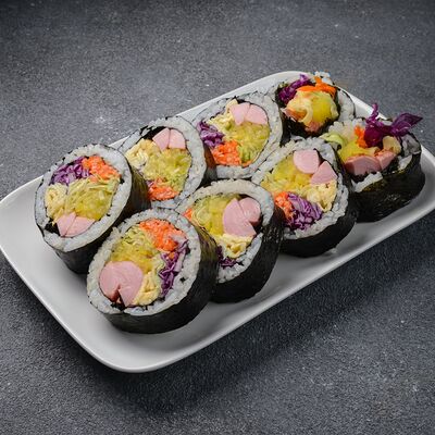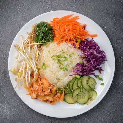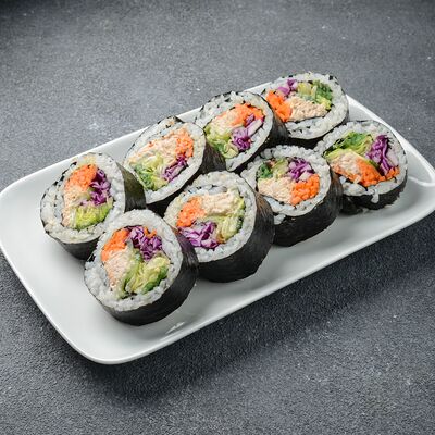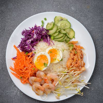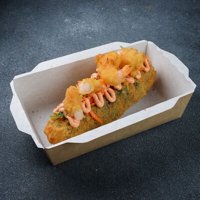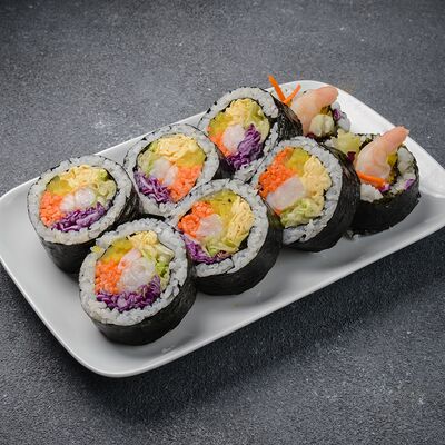 Рис, креветки, морковь корейская, чука, огурец маринованный, соус спайси