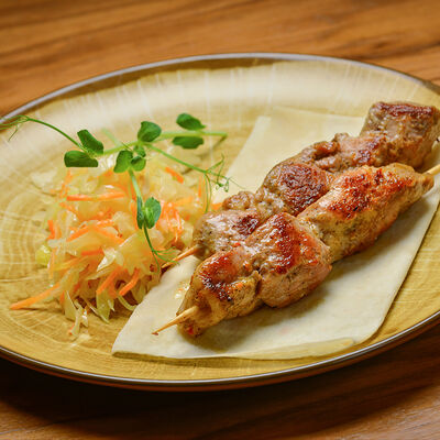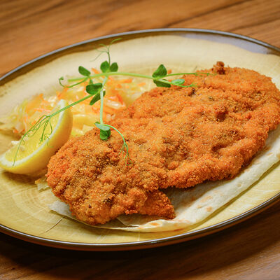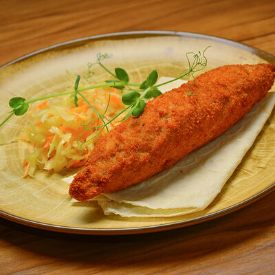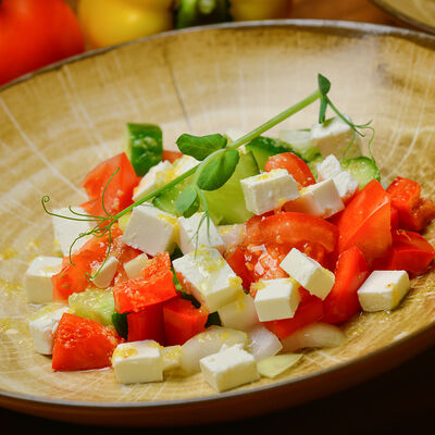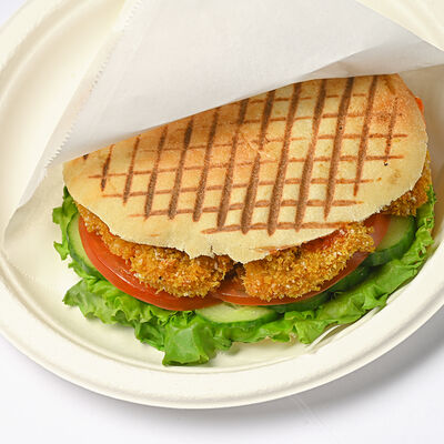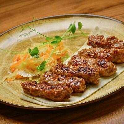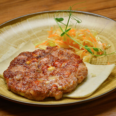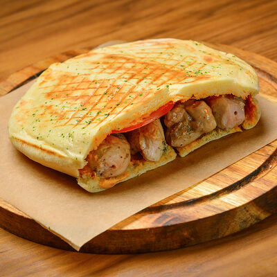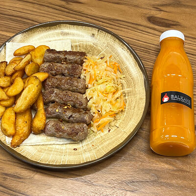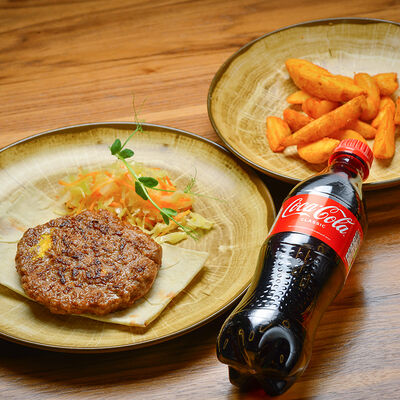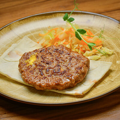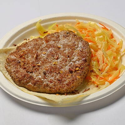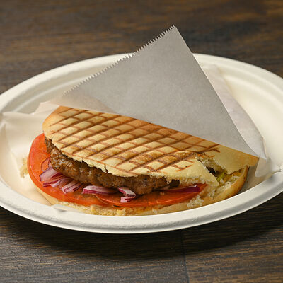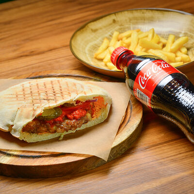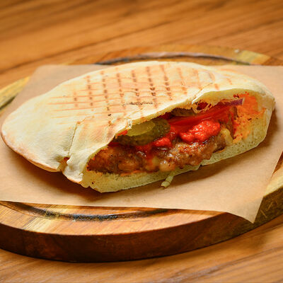 Пита с традиционной котлетой из Сербии (говядина 80%, свинина 20%) с сыром и cвинoй копченой грудинкой, приготовленной на гриле, свежими томатами, маринованными огурчиками, красным луком, айваром, соусом урнебес