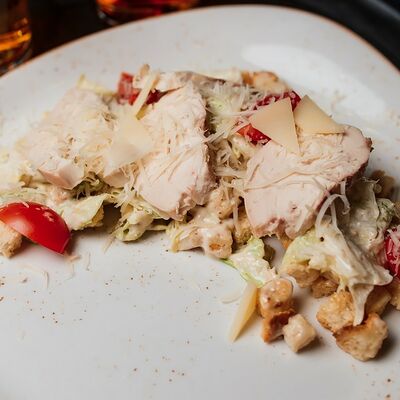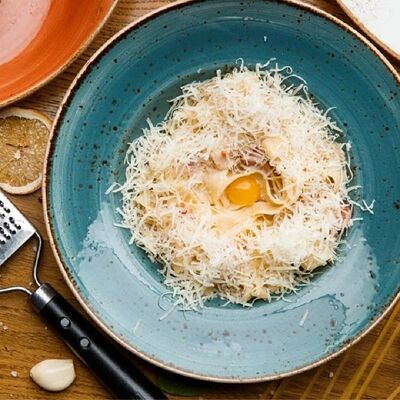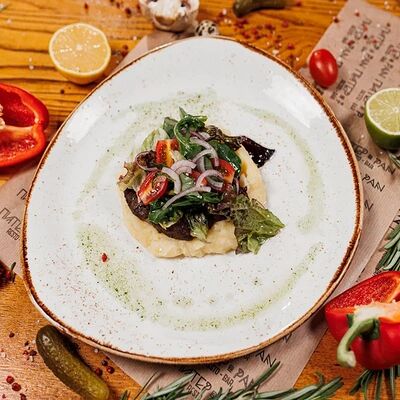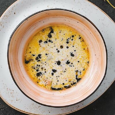 Индейка приготовленная су-вид, обжаренная на гриле, подаем на подушке из полбы с добавлением сливок и сыра пармезан