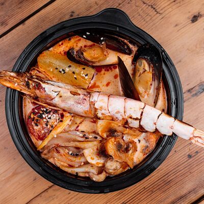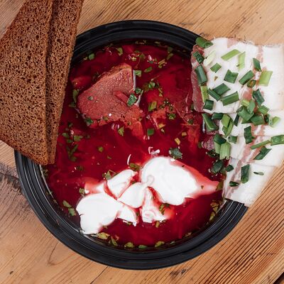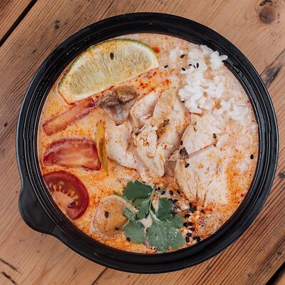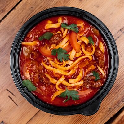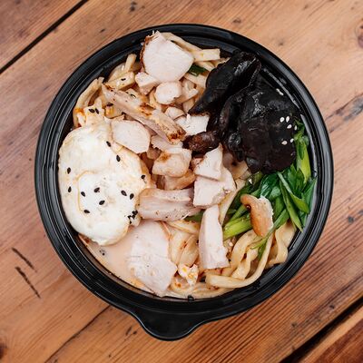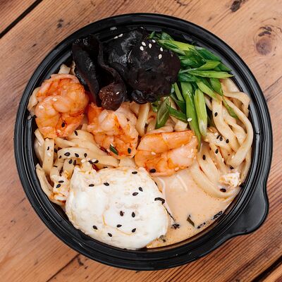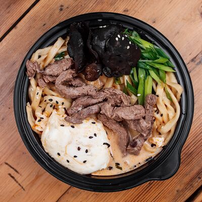 Вырезка говяжья, лапша домашняя, яйцо куриное, водоросли нори, сливки, устричный соус чили, куриный бульон