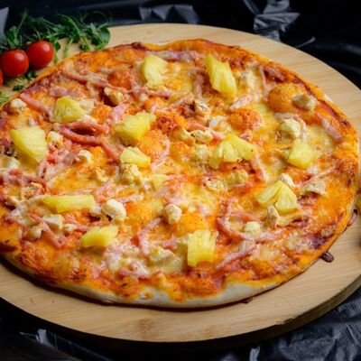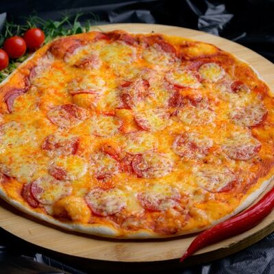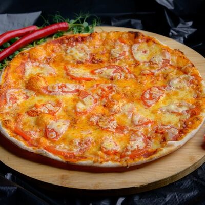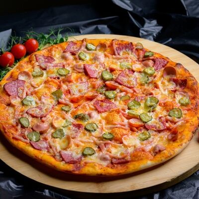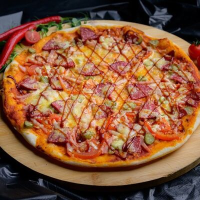 Тонкое тесто, ветчина, колбаса полукопченая, помидор, маринованные огурцы, томатный соус, сыр моцарелла, соус барбекю (32 см)