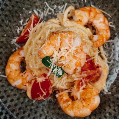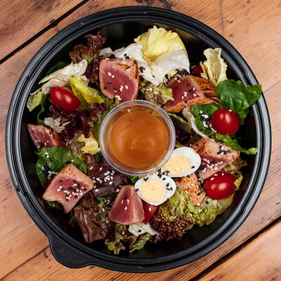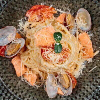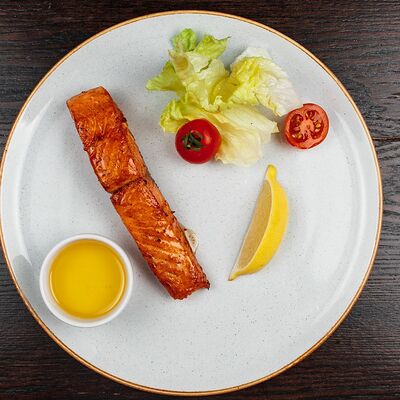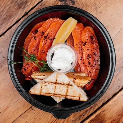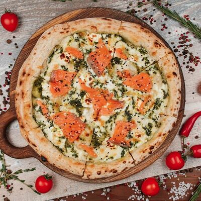 Лосось слабосоленый, соус сливочный, сыр Моцарелла, крем чиз, соус Песто, кунжут (33 см)
