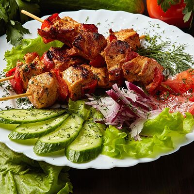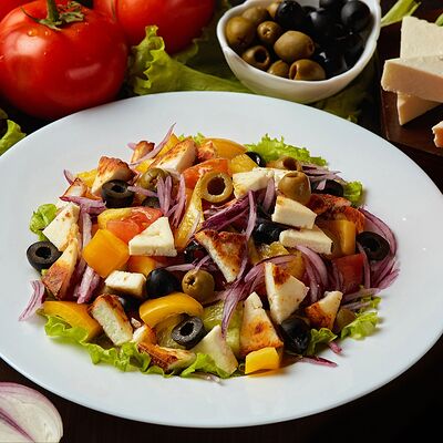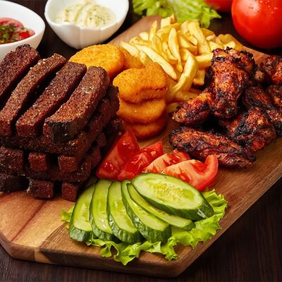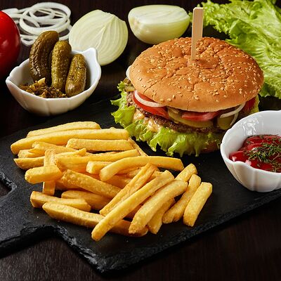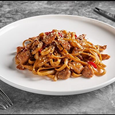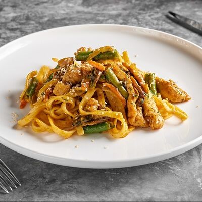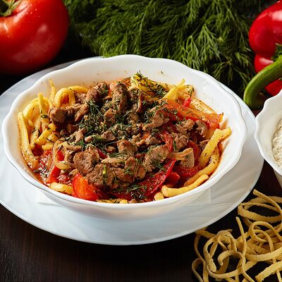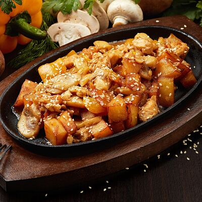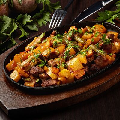 Говяжья вырезка, картофель, перец, помидоры, фасоль стручковая, лук, соус терияки, кунжут, зелень