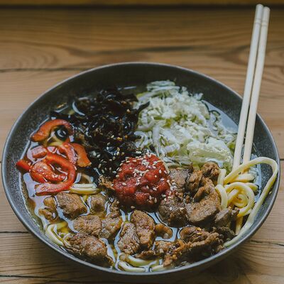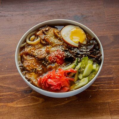 Рамен, насыщенный говяжий бульон, пекинская капуста, огурец, грибы муэр