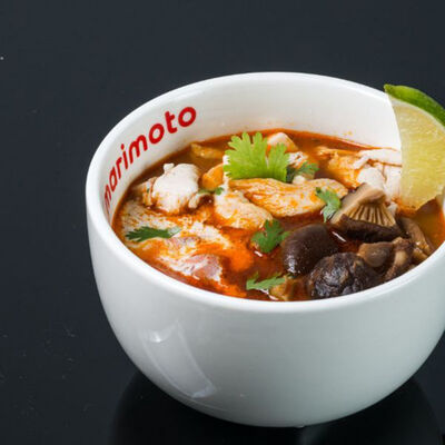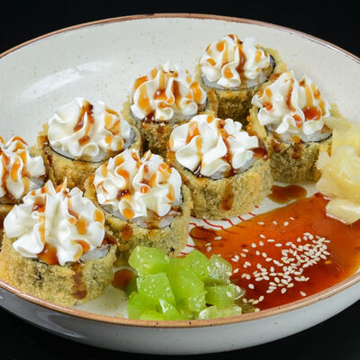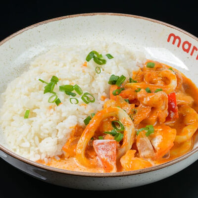 Рис, обжаренный со свежими овощами, грибами муэр и креветками, заправленный фирменным соусом моря. Посыпается зеленым луком и кунжутом