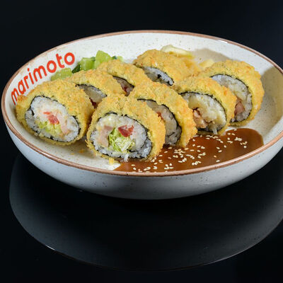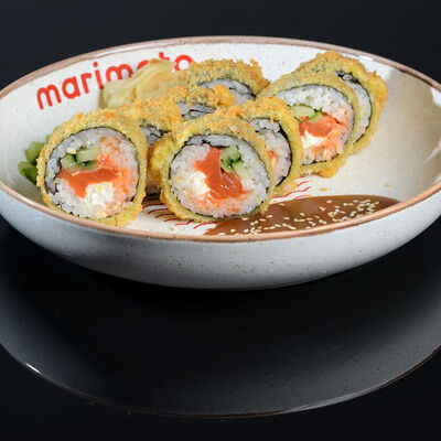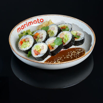 Ролл закрытого типа с начинкой из моркови по-корейски, салата айсберг, плавленого сыра, томатов и куриной грудки су-вид. Маринованный имбирь, васаби, соус ролл