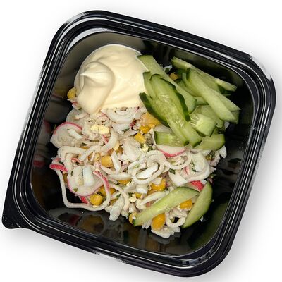 Крабовые палочки, кукуруза, майонез, петрушка, яйцо куриное, огурец свежий