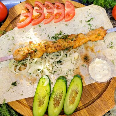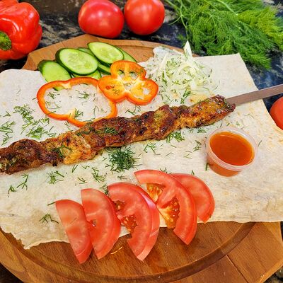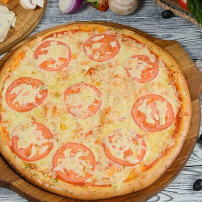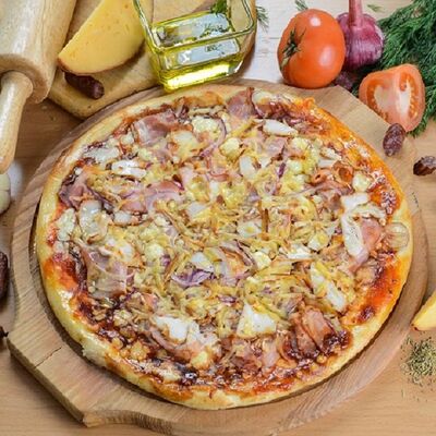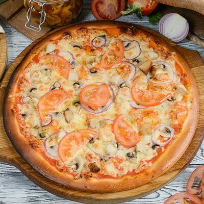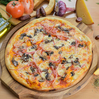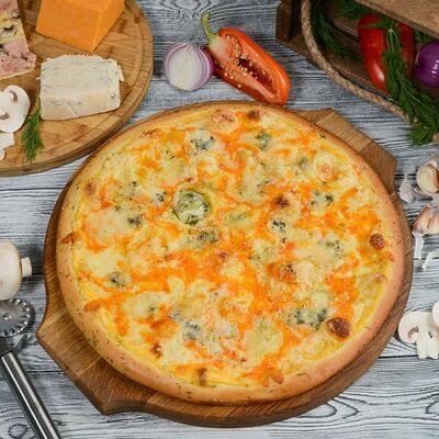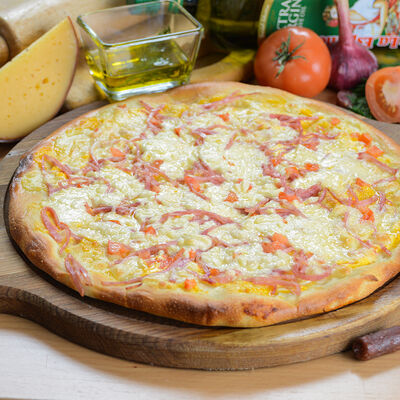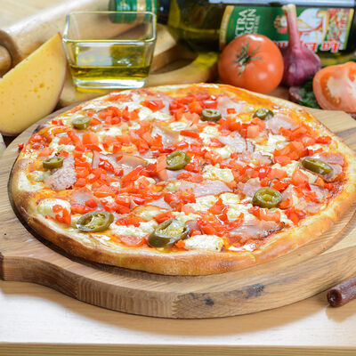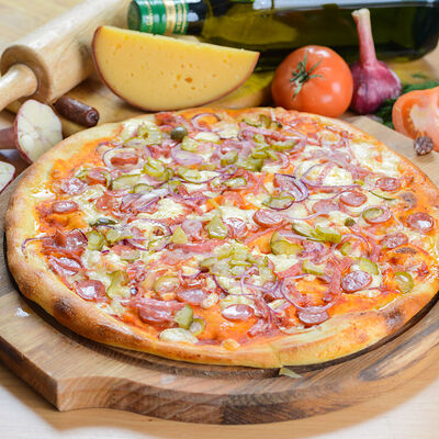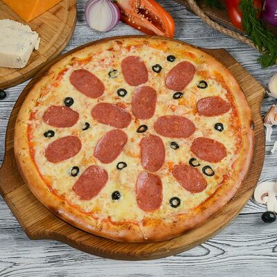 Колбаски охотничьи, огурцы маринованные, маслины, сыр моцарелла, сыр креметте, перец болгарский, соус сырный (31 см)