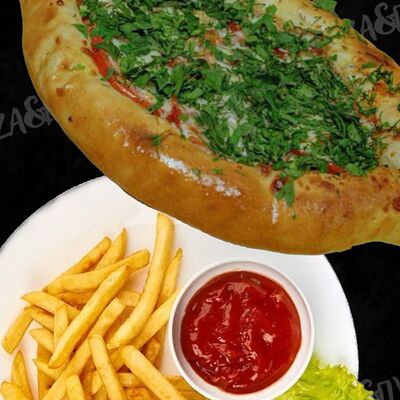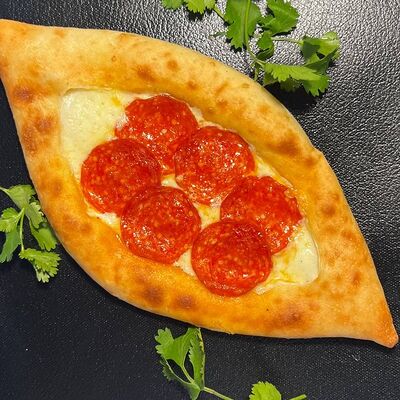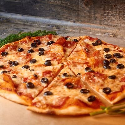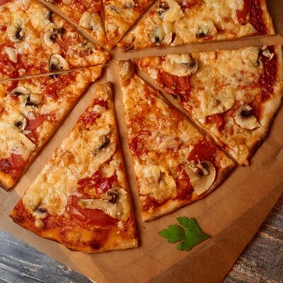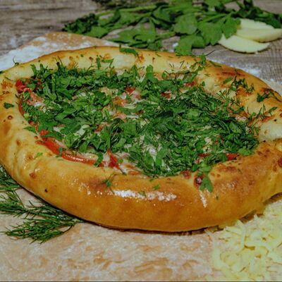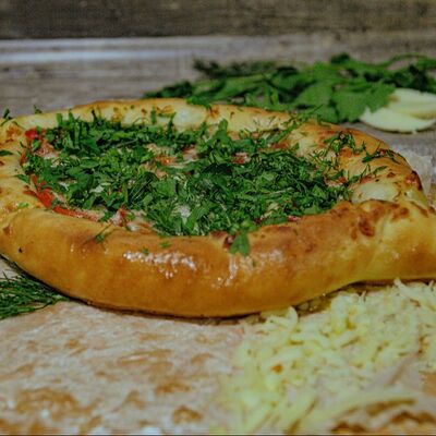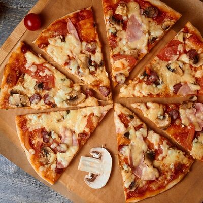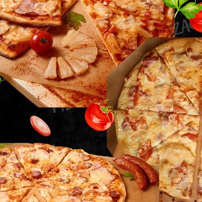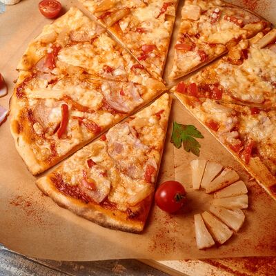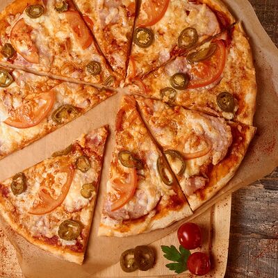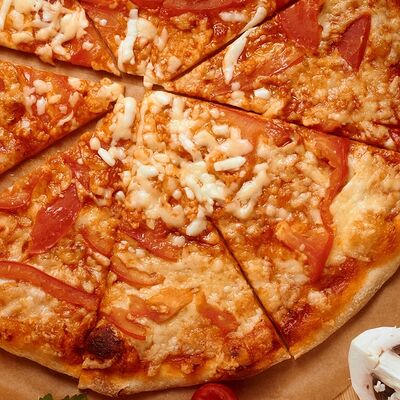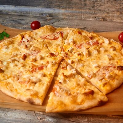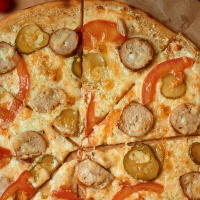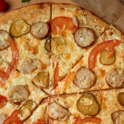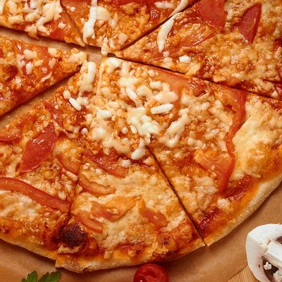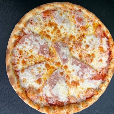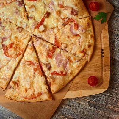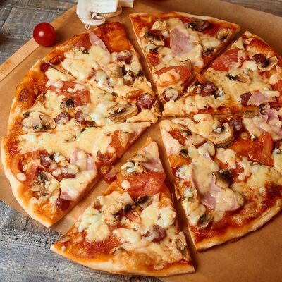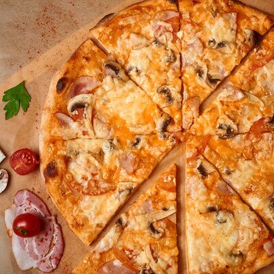 Тесто, помидоры, ветчина, соус томатный, сыр