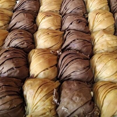 Пахлава состоит из тонкого теста, обычно фило, с измельчёнными орехами (обычно фисташками, миндалем или грецкими орехами) и сахарным сиропом