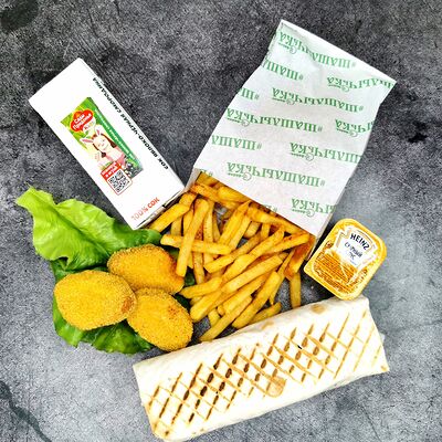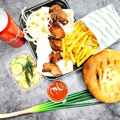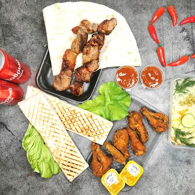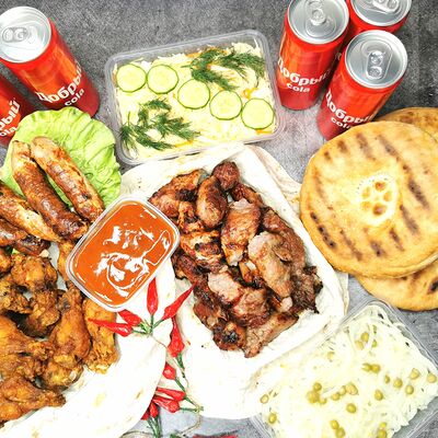 Шашлык из мякоти свинины (5 шт.), крылышки (12 шт.), куриные колбаски (5 шт.), лепешка с мангала (3 шт.), напиток газированный Добрый Cola (5 шт.), маринованный лук, витаминный салат, соус, лаваш, огурец, зелень